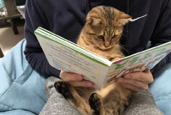 主人翻一页 , 它就跟着看一页 , 脑袋还会跟着图片的位置微微转 , 这专注度 , 我读书那会儿都没有过 , 它是真的在看啊 , 不是装的那种?