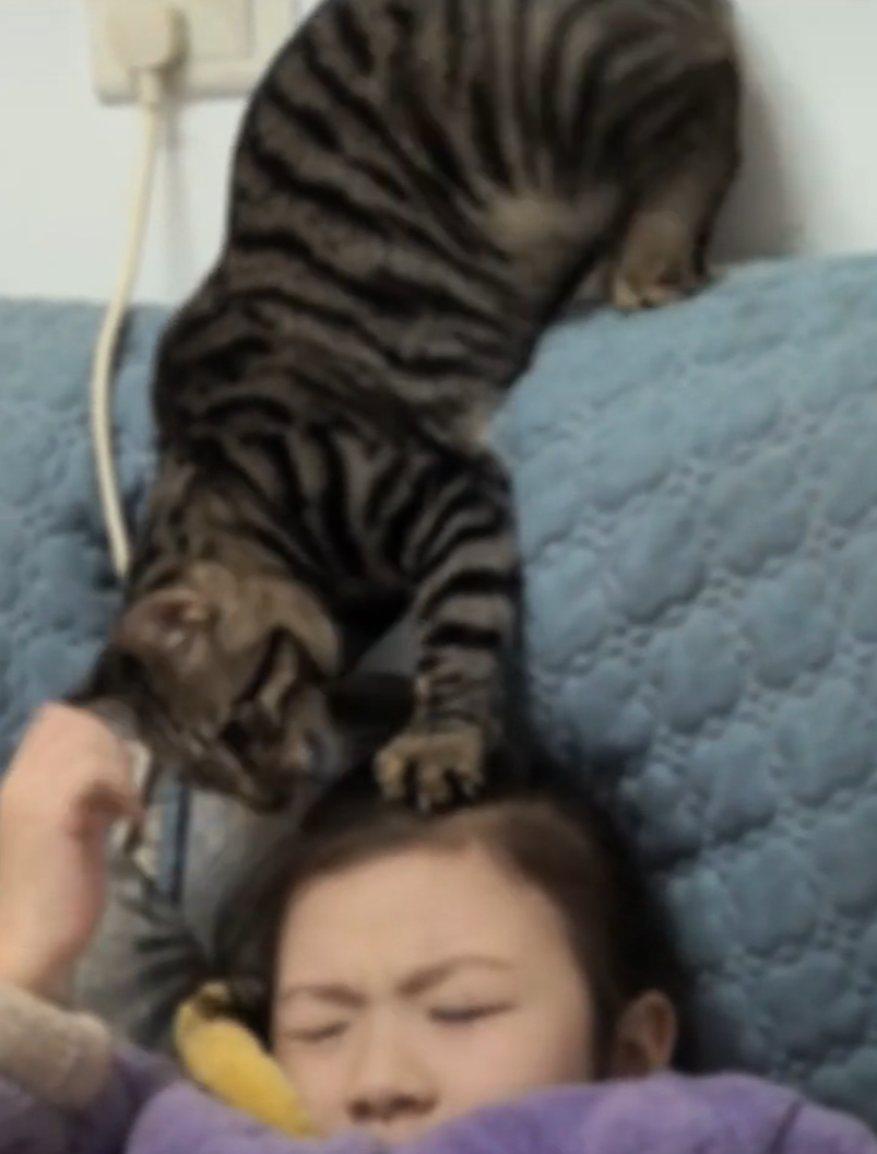前两天,孩子在沙发上坐着,猫从沙发靠背上下来时,一只爪子踩着孩子脑袋,还又趁机张嘴咬了孩子一口,想着先占点便宜。