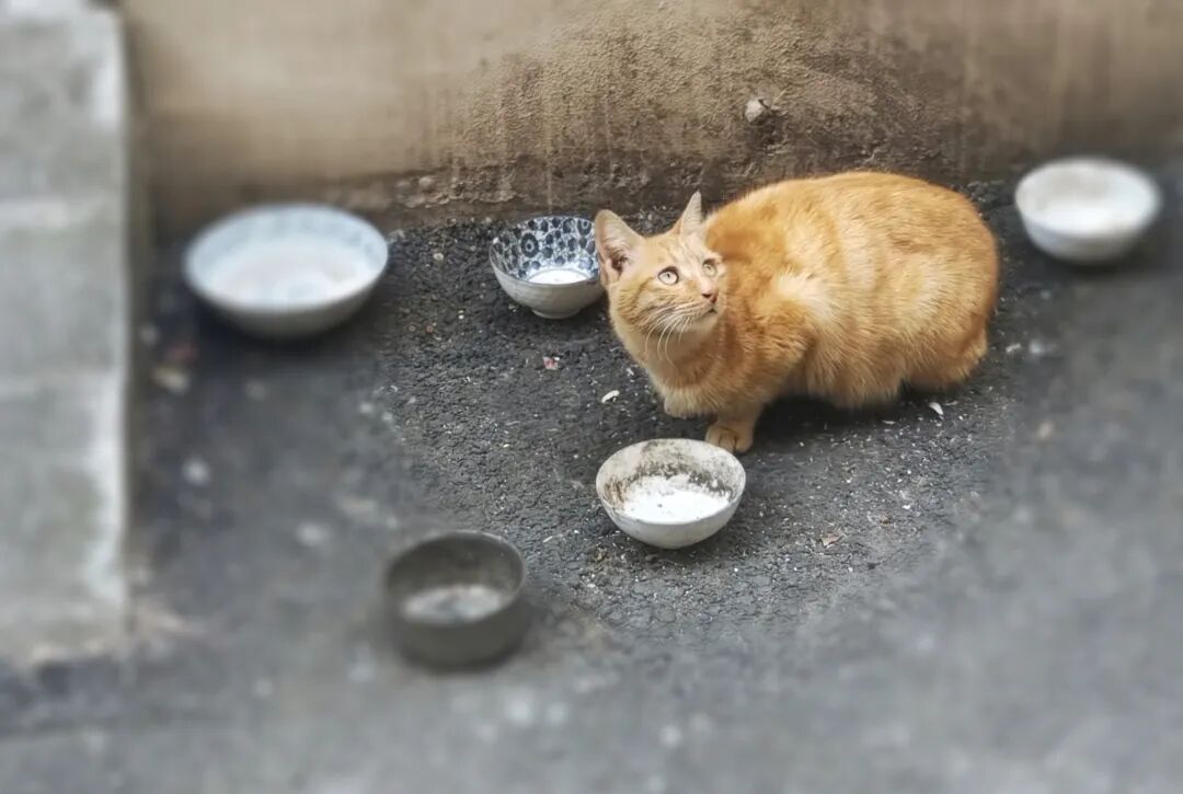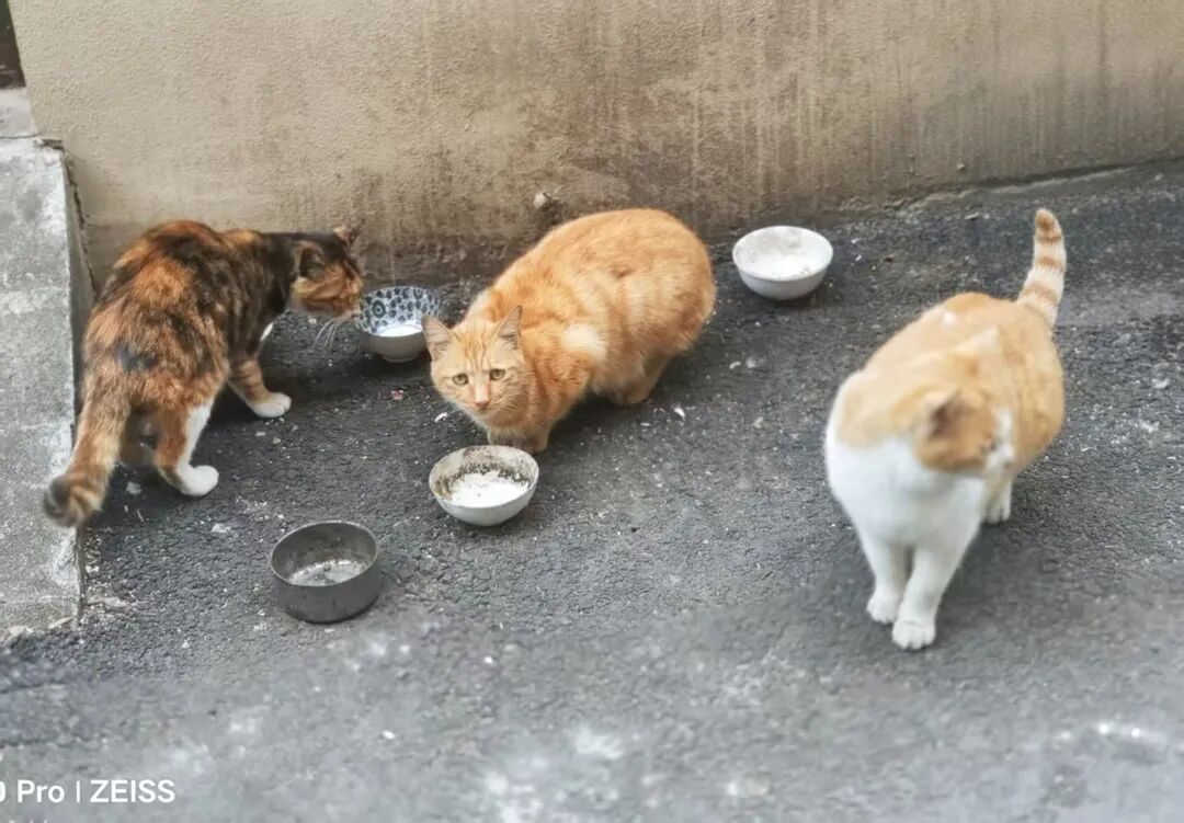 虽也有好心人专门为它们准备吃饭和喝水的碗,定时投喂,但有时根本不够吃。