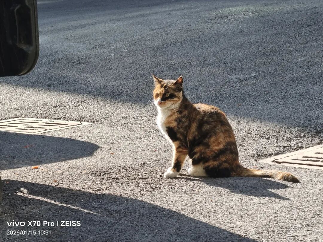 这只玳瑁猫特别谨慎,每天都蹲守在落水管旁,对它情有独钟,不离不弃。