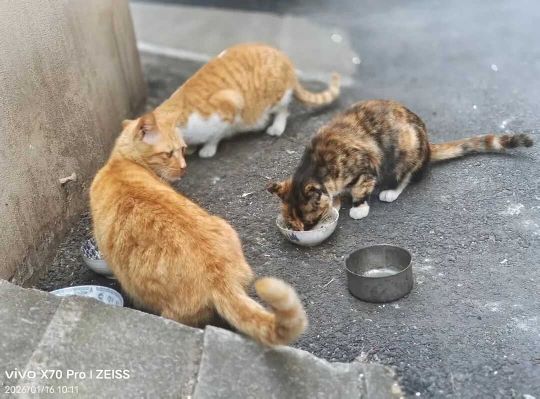 事实上,我之前也投喂过几次。猫妈妈就记住我了,小猫则有些后知后觉。如今,它们见我不再左躲右闪,它们在亲近我。都说不该投喂流浪猫,可当它们眼巴巴向你投来求助眼神时,你会无动于衷吗?很多时候于心不忍,是不是?