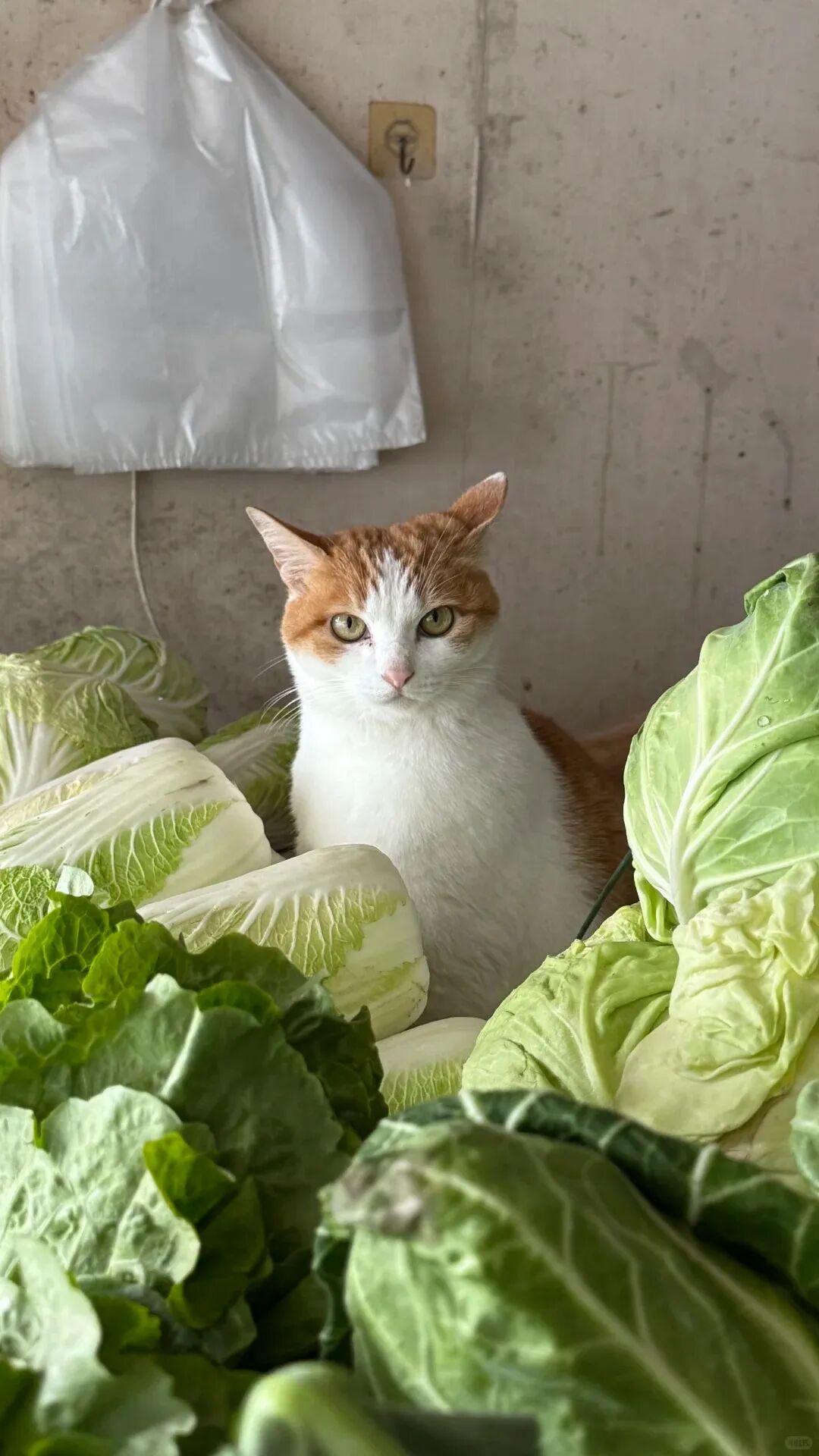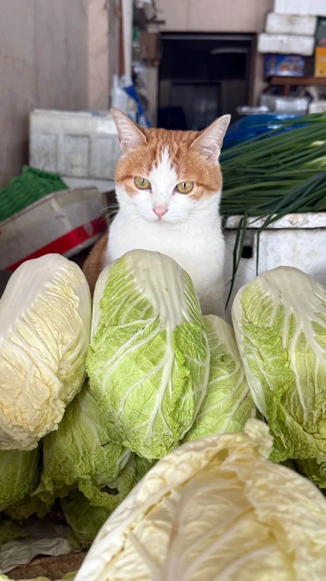 猫老板在专心卖白菜,一棵一棵的大白菜在猫老板的衬托下都显得更加可爱了。