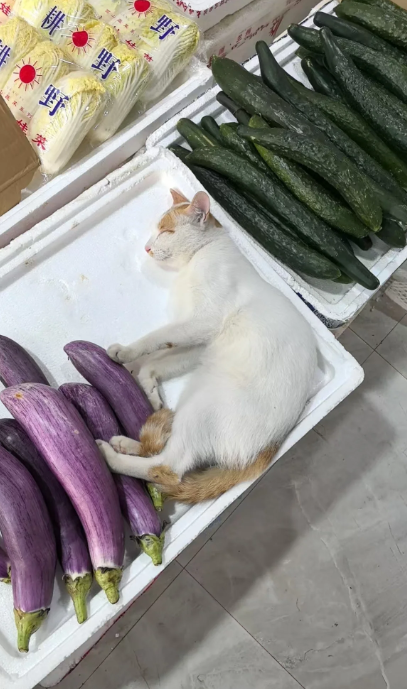 猫老板白天的主要任务就是卖菜,晚上还要熬夜抓老鼠,工作排得很满,偶尔休息一会儿也是应该的。