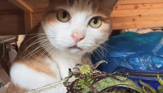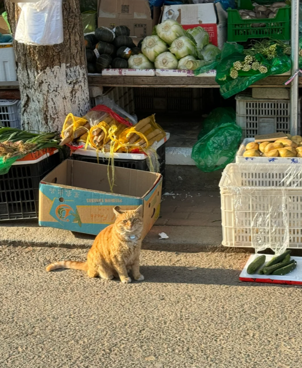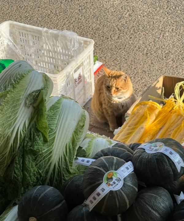 另一位网友>@>嗅嗅.去买菜的时候,也正好遇到一只猫老板在门口卖菜。