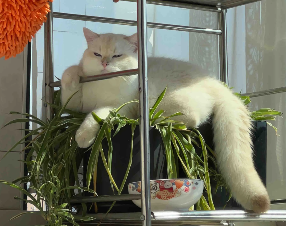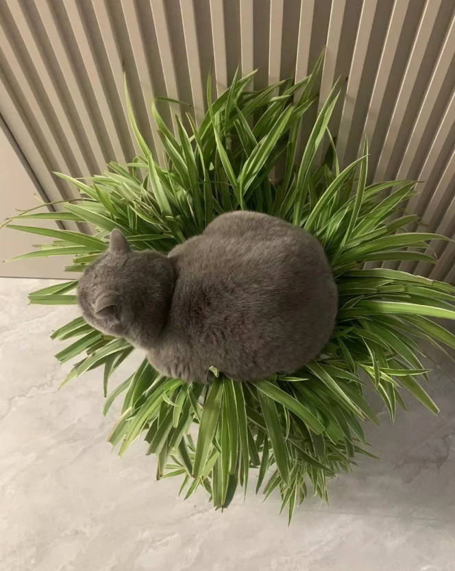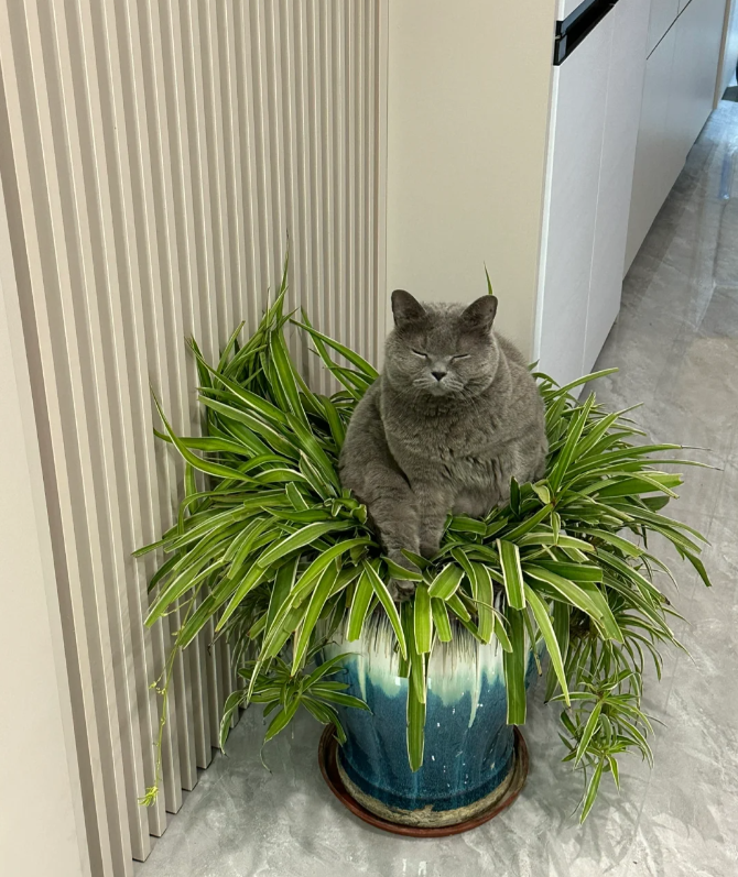 有时候坐在吊兰盆上,就像坐在自己的猫窝里一样。