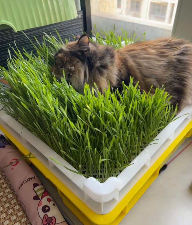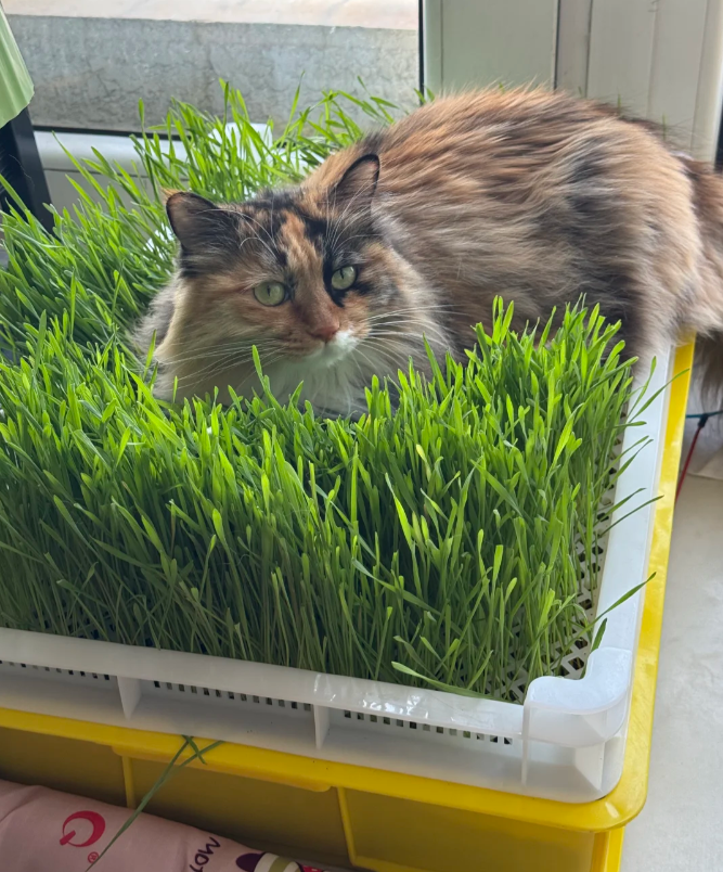 铲屎官>@>第十七个夏夜在家种了一大盆猫草,既满足了自己种植的欲望,又满足了猫猫吃草的需求。