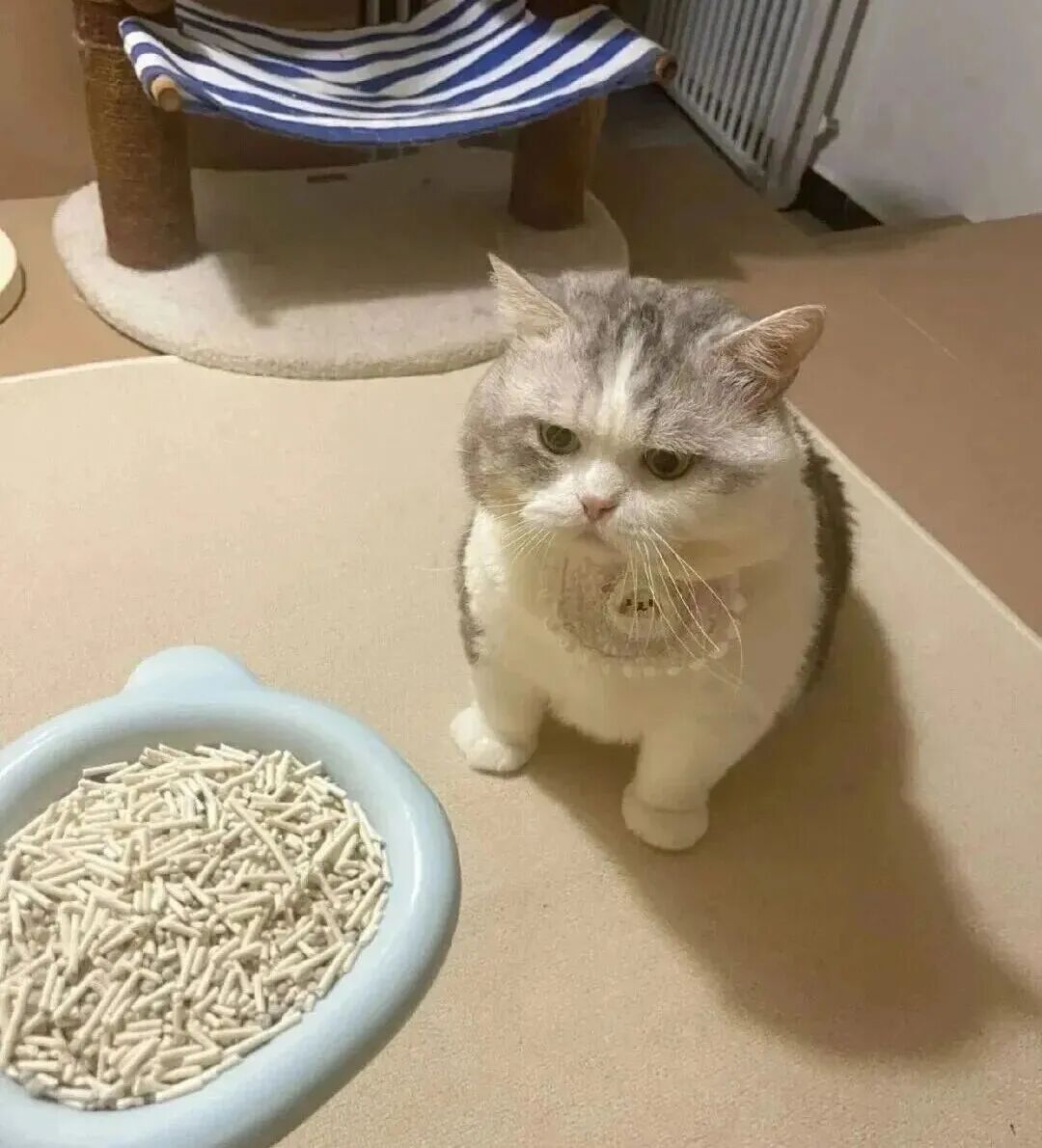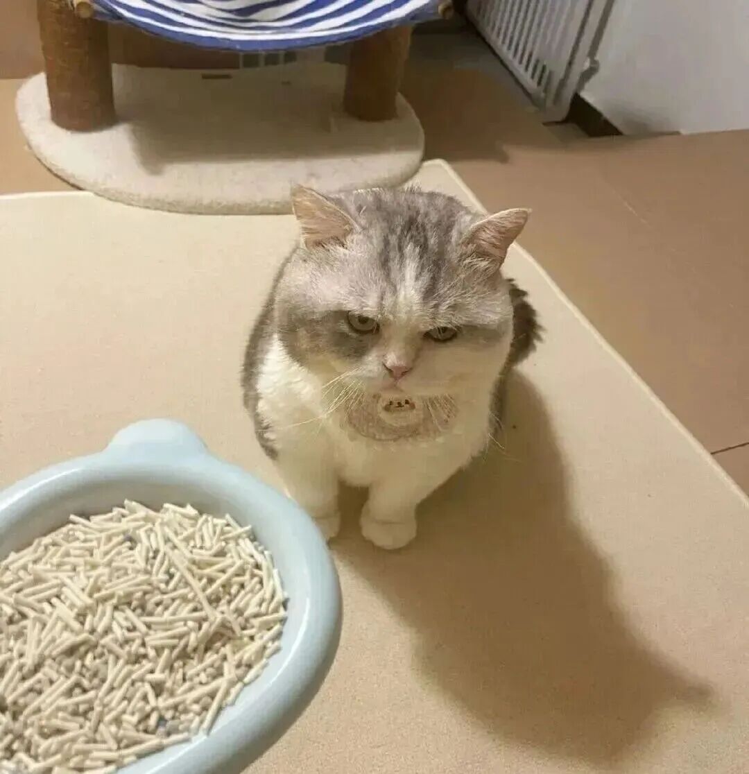 点开大图直接笑到打鸣,原来姥姥把猫砂当成了猫粮,满满一碗猫砂摆在猫面前,猫咪蹲在旁边,眼神里写满了“我是谁?我在哪?这是人吃的吗?”,仿佛在说:“姥姥你是想让我吃土吗?”