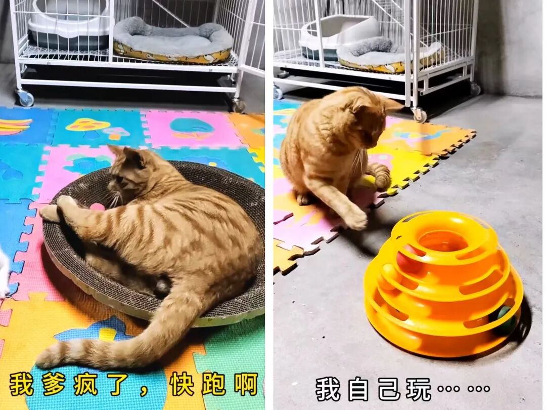 回顾小奶猫们刚刚会行走的那段,橘橘开始宣告主权。转转球是我的,你们不准动。猫爬架也是我的,你们不准碰,其实猫爬架以前给香香做的,就香香不爱玩。