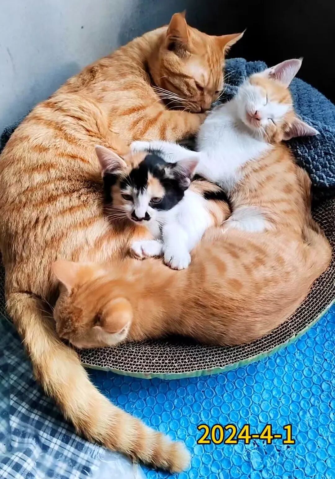 2024年2月5日,橘橘9个月大喜当爹。橘橘跟香香的5个宝宝出生了。分别是“柚柚、萌萌、芯芯、花花、墨宝。”香香临产的那晚先生的两只橘猫,后面生的三只黑乎乎的,大概是芯芯块头大,生起来特费劲。铲屎官都不敢打扰它,这橘橘硬是钻进去看看,好在香香那时候没排斥它。