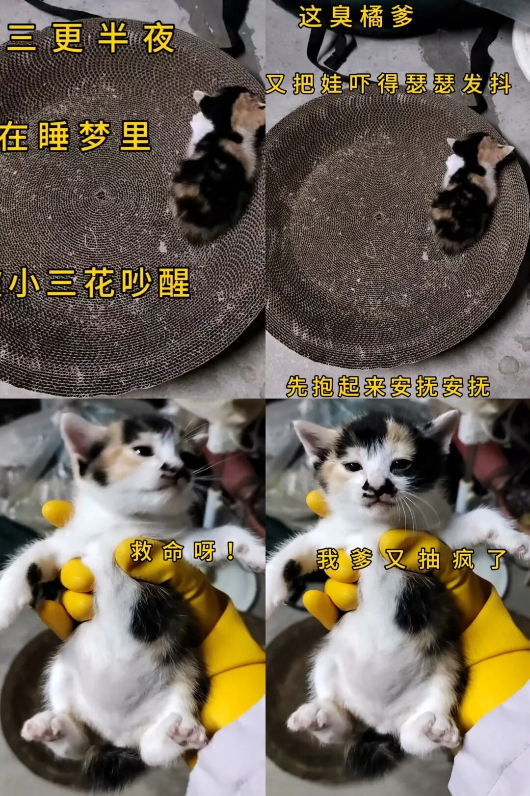 未料低估了这旁边的橘橘。从此三更半夜楼上时常传来小奶猫“哇哇叫。”一天天给你制造惊喜,不重样换着来。以前只看到过母猫叼小猫,没想到公猫也会的。橘橘这举动让小奶猫们对它恨之入骨。特别是芯芯它不哈铲屎官姥姥,橘橘一凑近它就哈它哈。