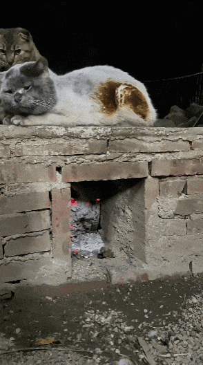 看看这几只小毛球,一起挤在火堆旁,开启了“集体烤火”模式。一个个被烤得烟熏火燎,却依然坚守阵地,不肯离开温暖的灶台半步。