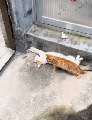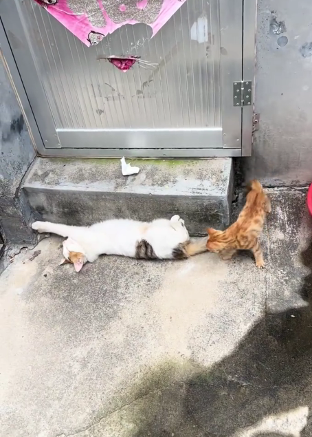 外出玩回来了的小猫,看到此刻的妈妈正在躺在一旁睡觉,小猫过去打招呼,猫妈由于睡得正香并没有感觉到。