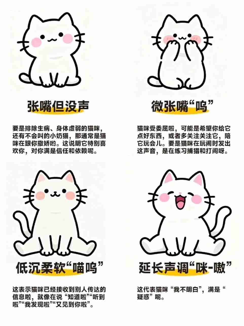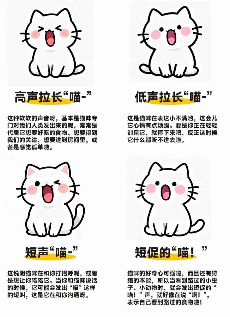 低沉柔软 “喵呜”~表示接收到信息啦,像 “知道啦”“听到啦”“我发现啦”“又见到你啦”~