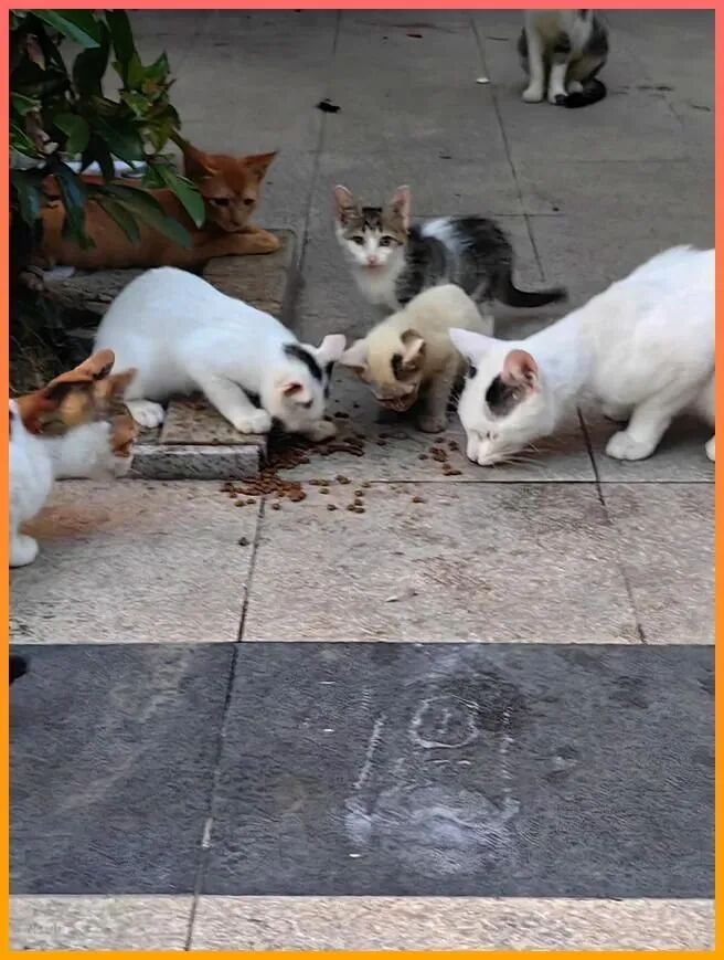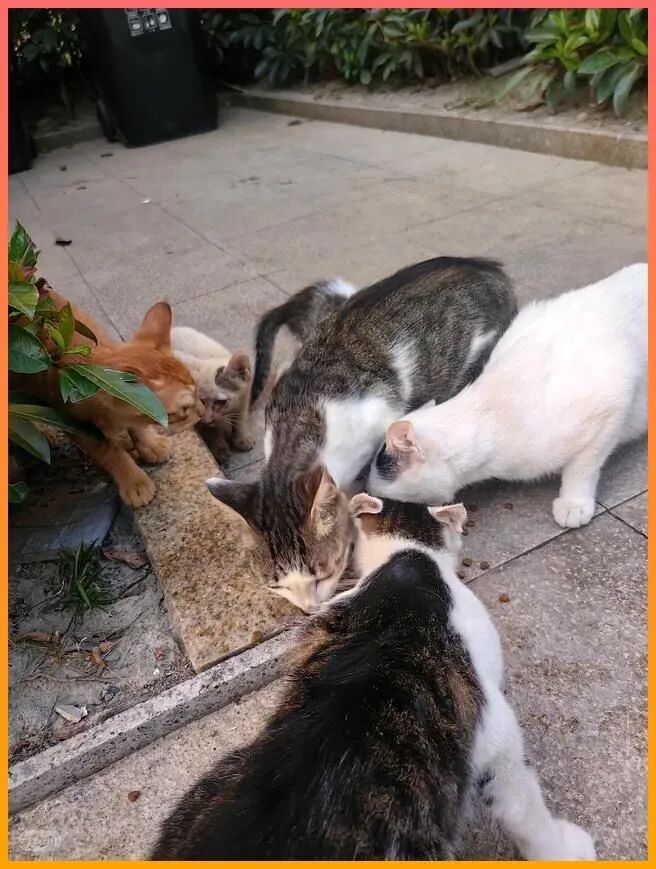 有一只奶牛猫鼻子上有伤口,刚刚结痂,呼吸的时候有点喘,我蹲低了一点,看它一边吃一边警觉地盯着我,像随时准备逃跑,我知道它们每只都不是第一次受伤,只是没人看见罢了,橘猫吃完了以后,慢慢走到我的脚边,离得很近,像是在试探我会不会伤害它,我没有动,怕它害怕,它就安静地趴下来,眯着眼睛,没再抬头