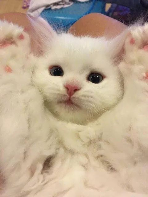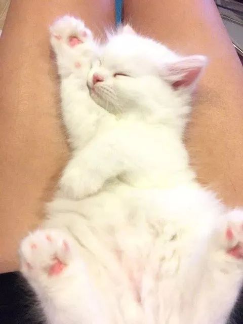 网友 @Fieldkys 家的小奶猫,总爱肚皮朝上,乖乖地躺在主人腿上撒娇。