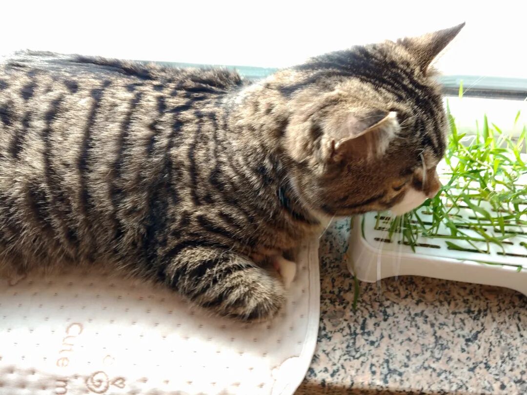 想不清楚是哪只猫咪了,还吃豆沫子,可把老妈高兴坏了,提起它来就夸。还有那像麦苗的草,也张嘴吃几口,现在想想那就是它们的化毛草呀。