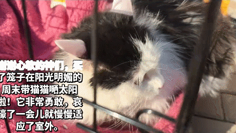 小姐姐还带着猫咪出门晒太阳,怕猫咪应激跑丢,专门买了笼子。猫咪也非常勇敢,哀嚎了一会儿就适应了户外。