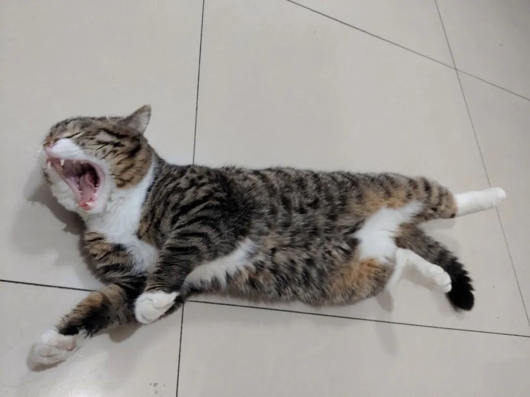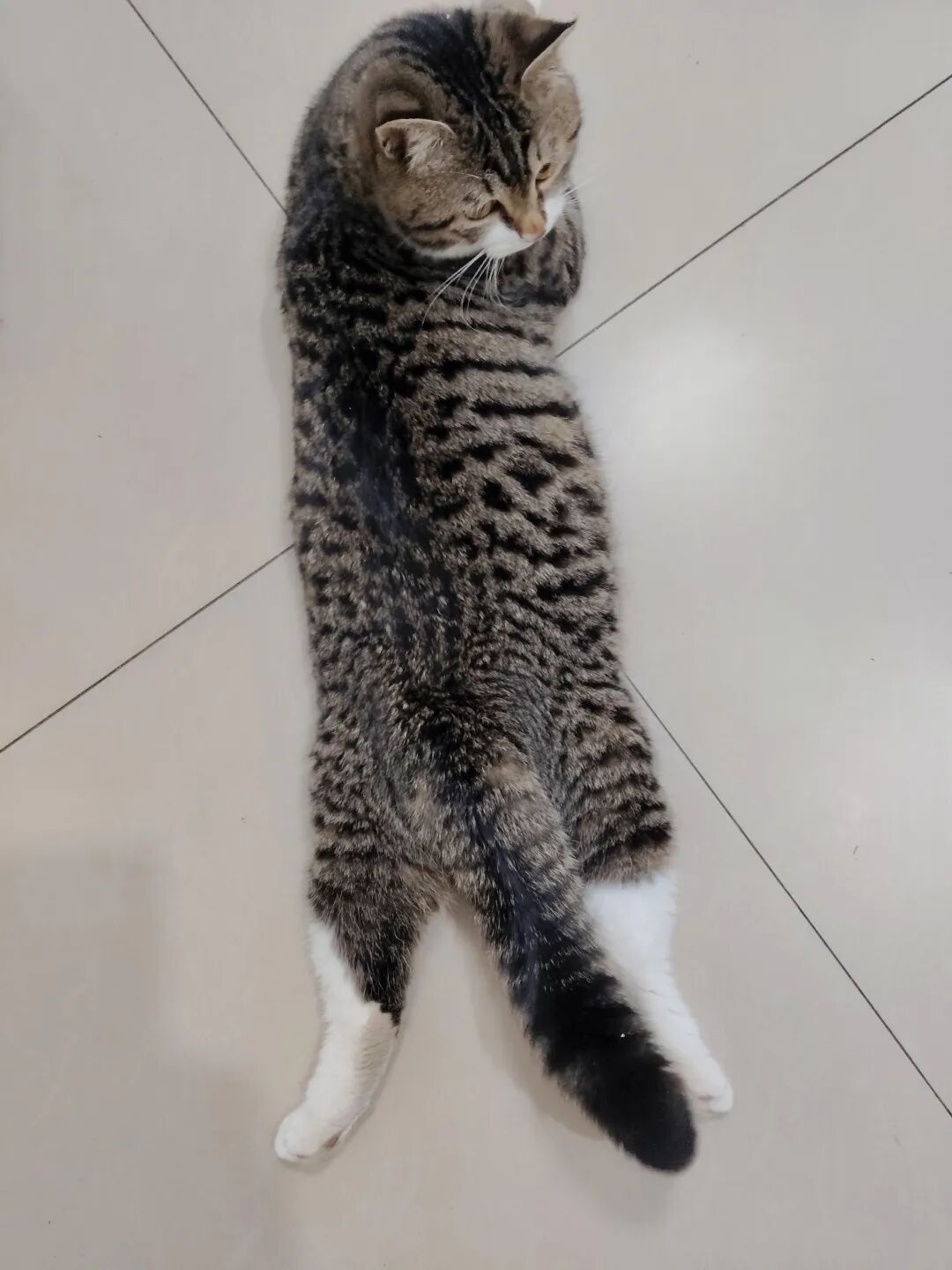 没大一会儿,小宝出汗了,猫仔也累得趴在了地下,两天后腿只挺挺的铺在了地板上,我喊小宝快过来看呀,看看它这是啥模样。
