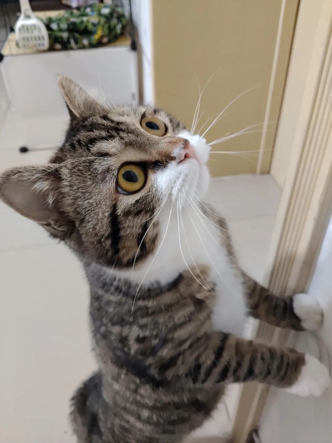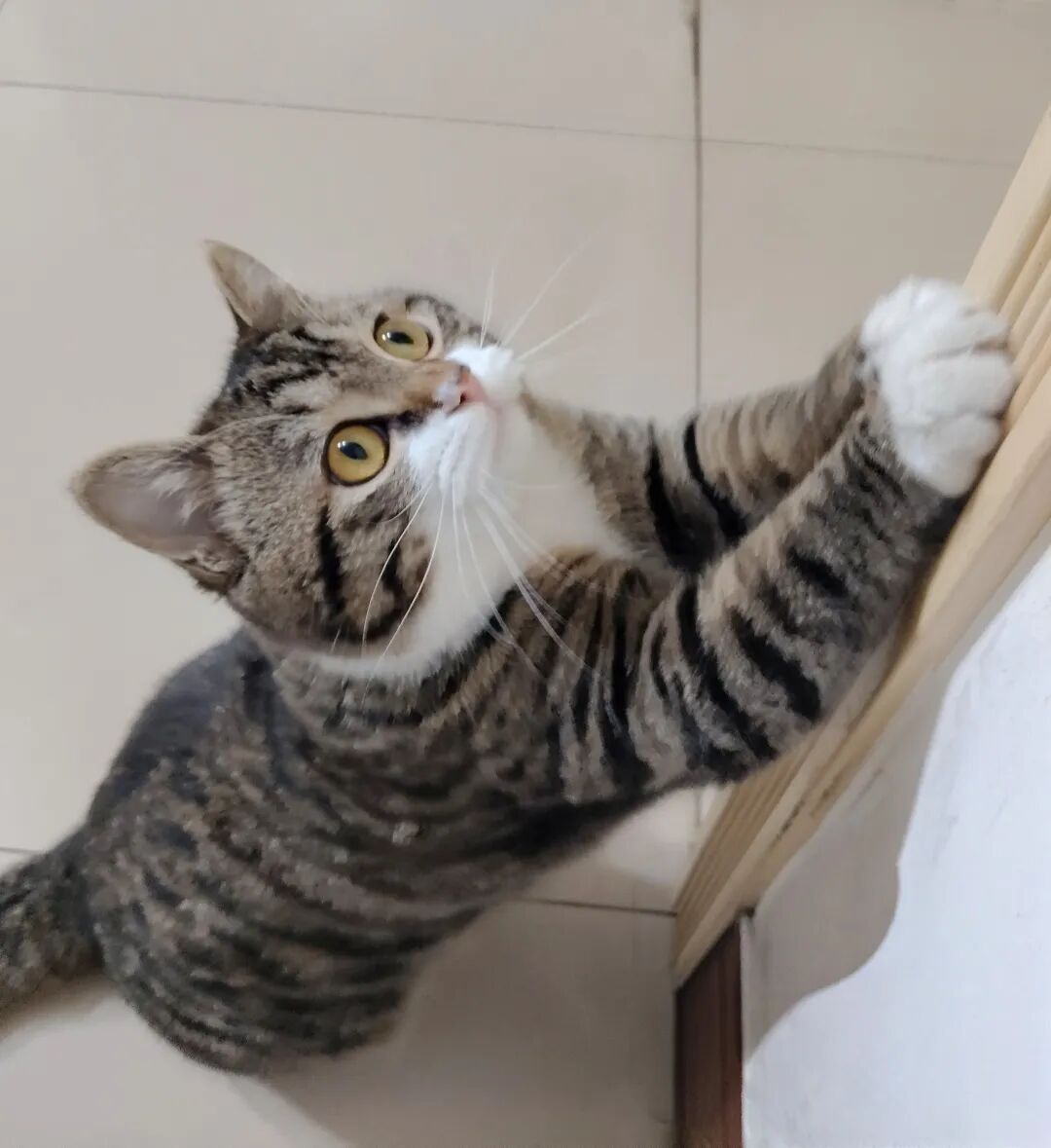 想着把猫仔也带出去吧,这个小仔仔,只要带牵引绳就反抗,好不容易套上,抱到楼下。