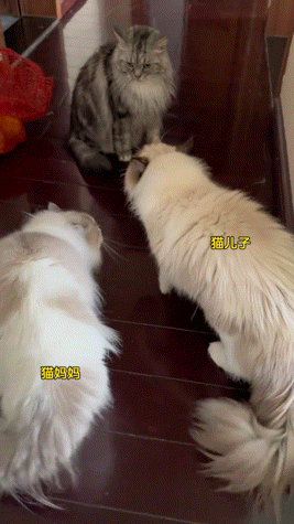 然后猫妈看到后,就一直在旁边劝阻,希望自己的儿子能冷静一些。