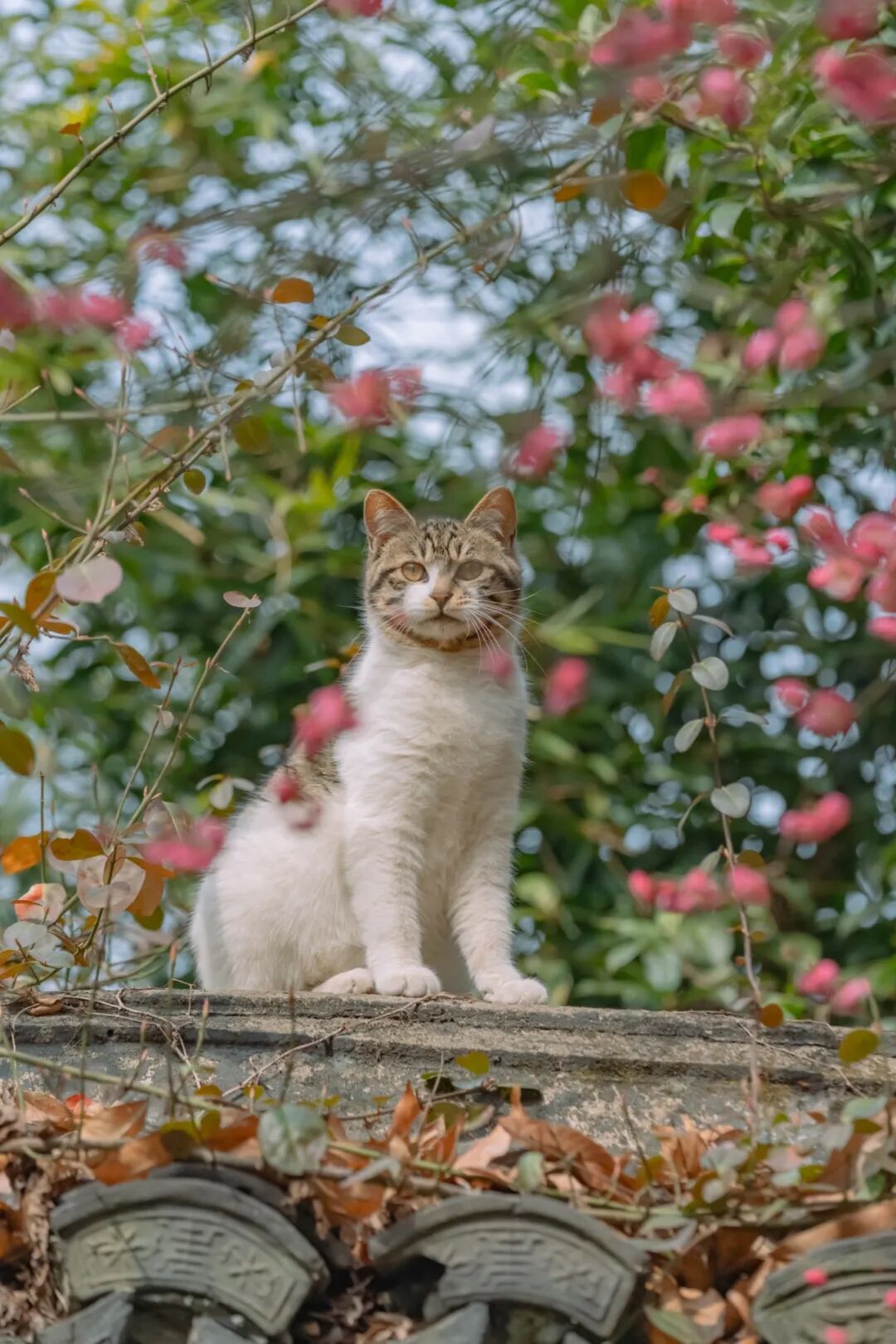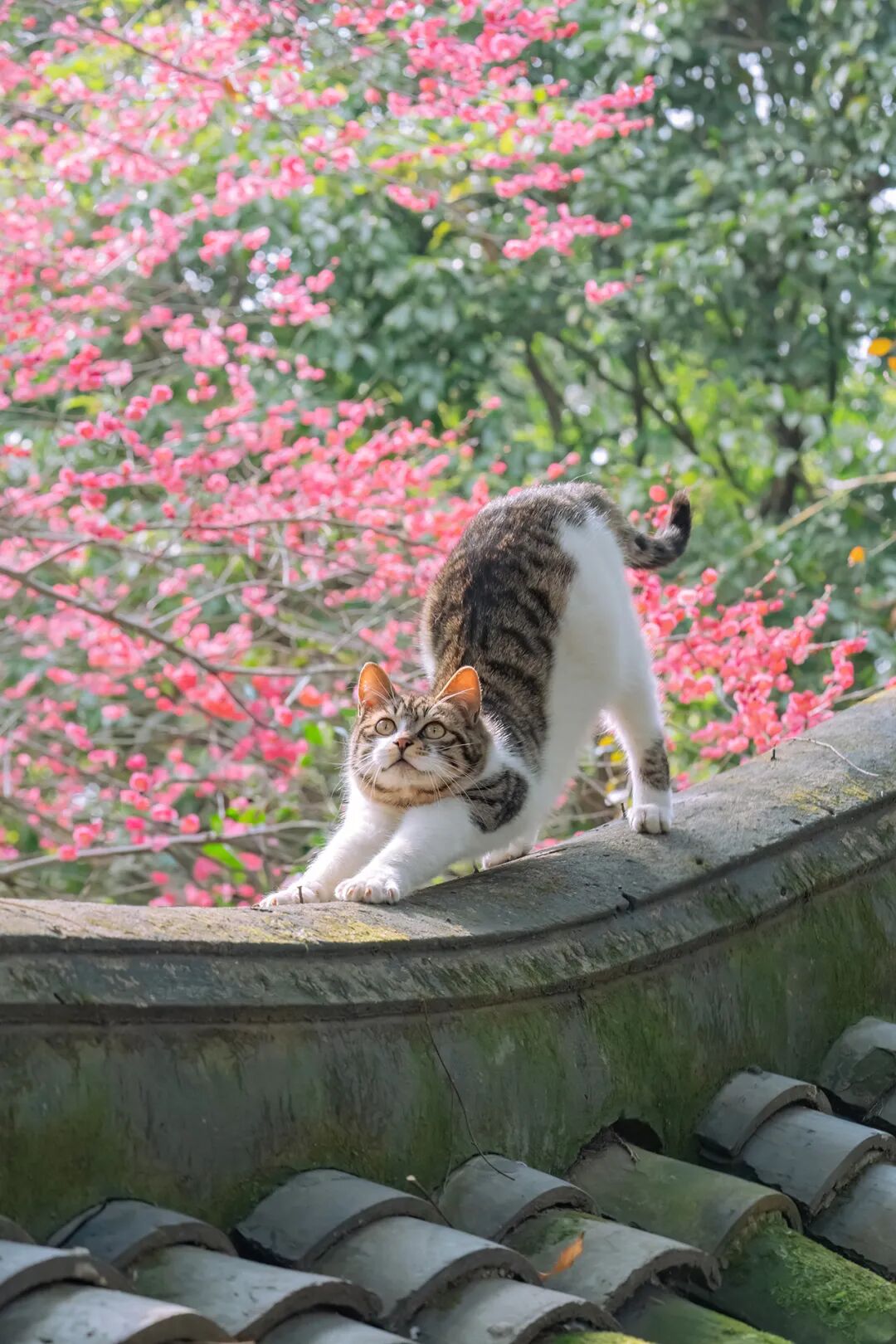 今天是立春,应景发一组梅话和猫斗俏图,这是去年在杭州西湖古建拍到的,一只狸白猫在墙顶上溜达,走着站着看上去小胖,一伸个懒腰感觉脸到脖子都是肉肉。附近正好还有一棵红梅开得正艳,和猫一前一后似与其斗俏,但要比翘看图4,那还不是猫猫完胜 >我们>新年的猫猫日历>还有部分剩余,>365天每日一猫,>喜欢请戳下方评论置顶>