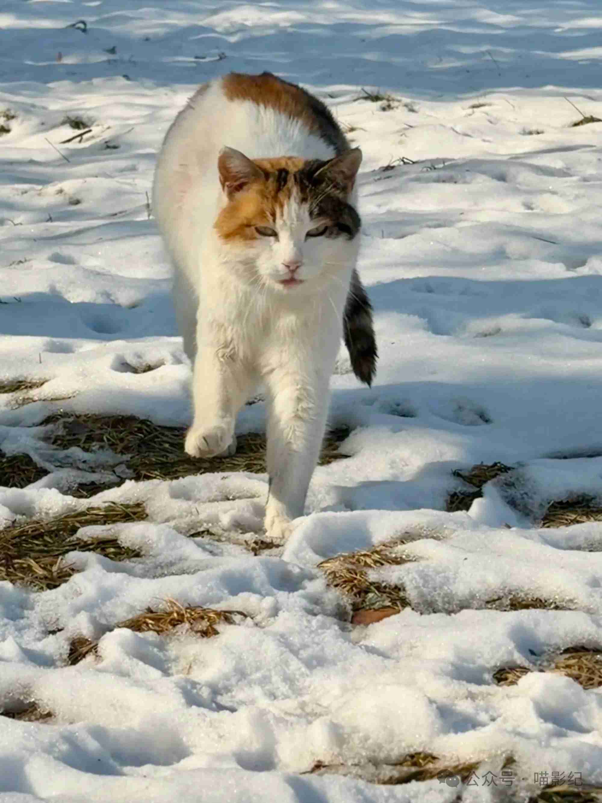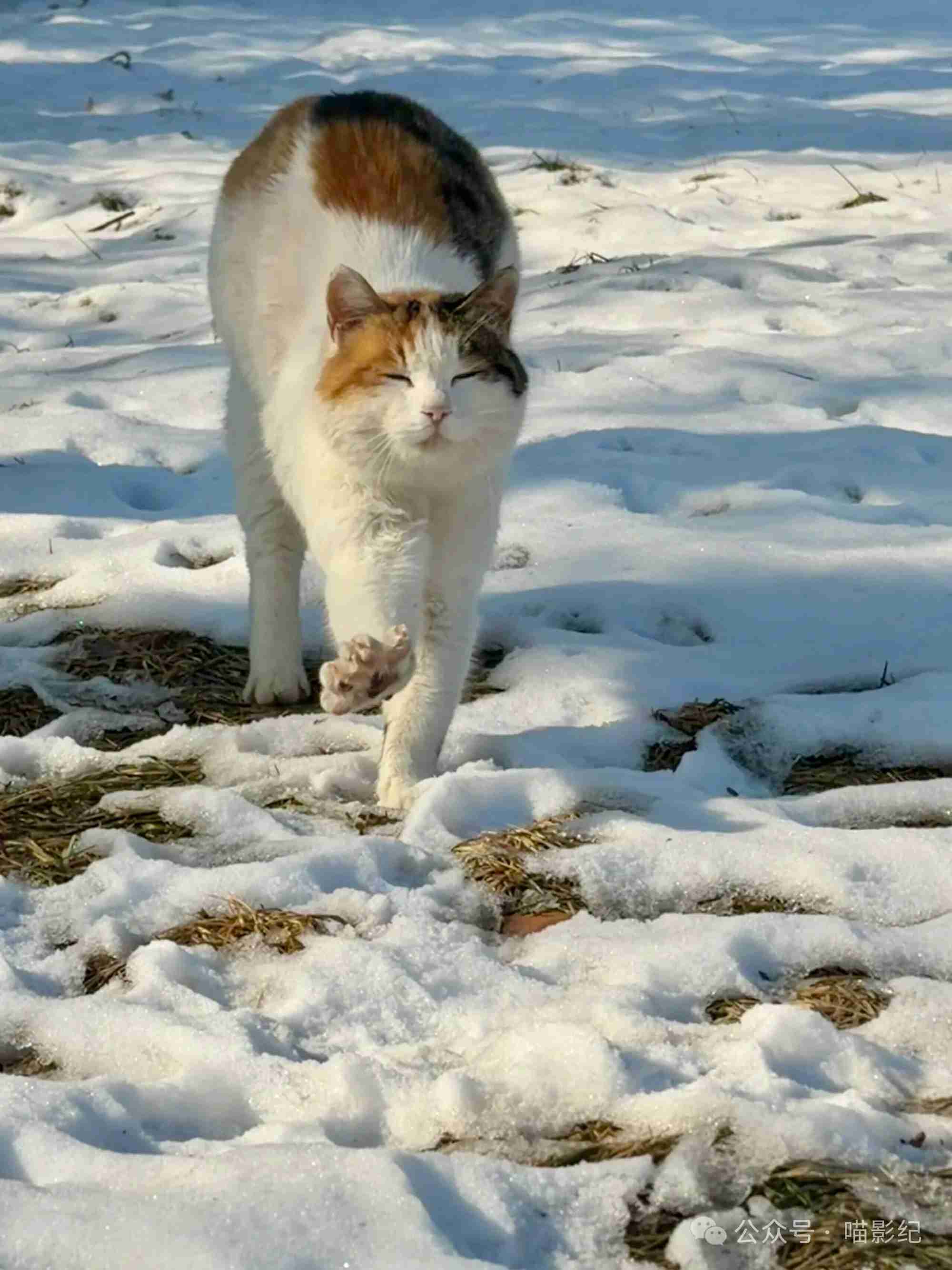 三花猫在雪地上,把身子拉成一座柔软的桥。爪子举向天空,仿佛要抓住那片路过的云。阳光顺着毛尖滑落,白的是雪,棕的是蜜,黑的是昨夜藏起的梦。