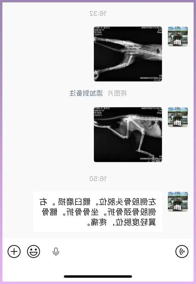 我叫了货拉拉直接送去医院,医生一检查脸色就变了,让我先拍片子,X光.片出来的时候我站在旁边看着屏幕,.医生指着片子说左侧股骨头脱位,髋臼磨损,右侧股骨颈骨折,坐骨骨折,髋骨翼轻度脱位,这小猫估计是从高处摔下来的,或者被重物砸过,骨盆那一块几乎全碎了。