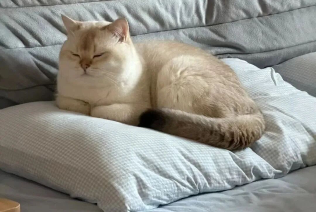 它睡你的枕头、腿弯、被窝中央。你翻身,它皱眉;你动一下,它一巴掌拍你,像是在说:“别影响本喵休息。”