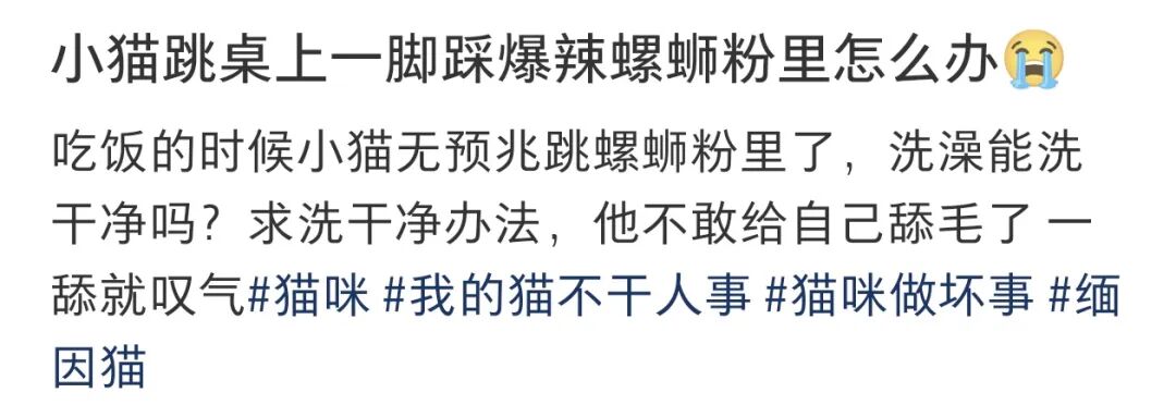 妹子@麦个椰子带着哭腔上网求助,说自己吃饭的时候,家里的小猫毫无征兆地,扑通一声就跳进了螺蛳粉碗里,还一脸崩溃地问大家:这只猫,到底还能洗干净吗?