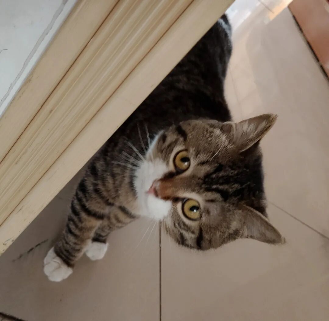今天中午,我与小宝商量着和猫仔躲猫猫,猫仔在大卧室,我和小宝躲在卧室门口墙边,我们猫了一下,再猫一下,猫仔已经窜到了墙边下,我和小宝都吓了一大跳,这速度也太快了。