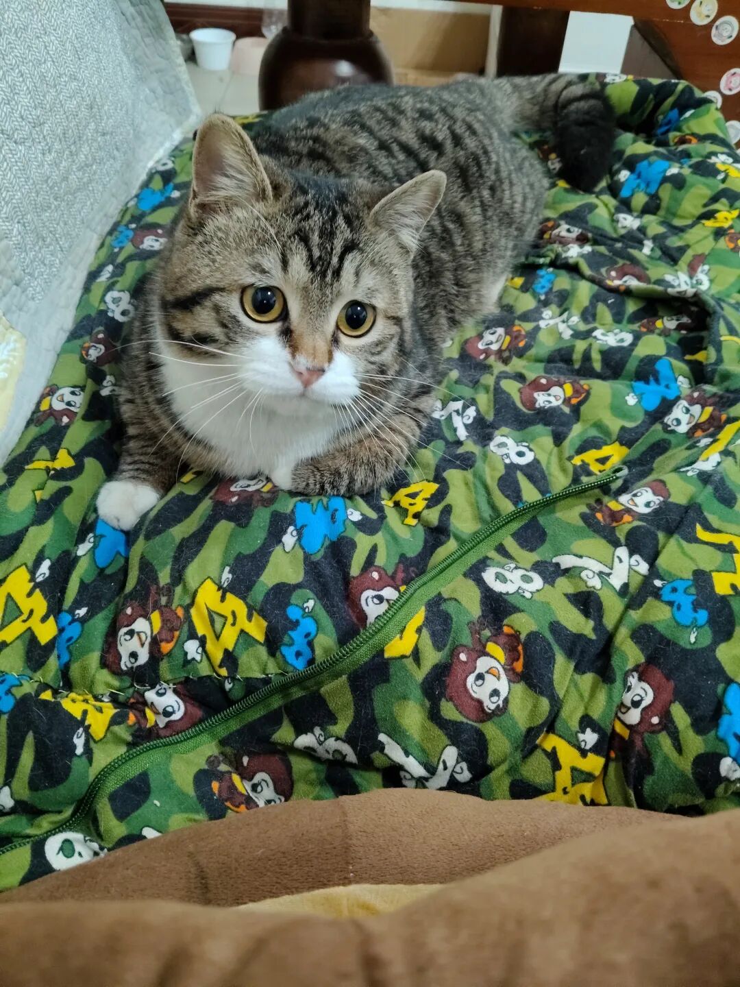 我领着小宝,掀了掀床头柜,猫仔露出了得意的表情,好像在说,没找到我吧,接着又装出手忙脚乱的样子,往床缝里钻。