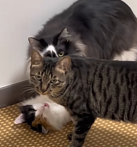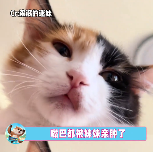 可无奈的是,它的反抗根本没用,依旧被其他小猫围着亲,到最后,它的小嘴都被亲肿了,模样又可怜又好笑。
