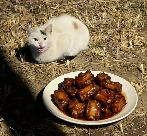 小猫坐在排骨面前,那叫一个愁哦!