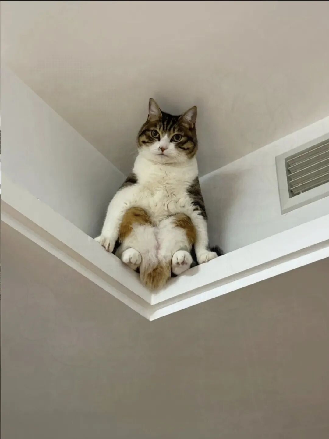 我家猫最近解锁了新地图——客厅那道房梁。每天我抬头,它准在那儿,稳得像尊雕像。