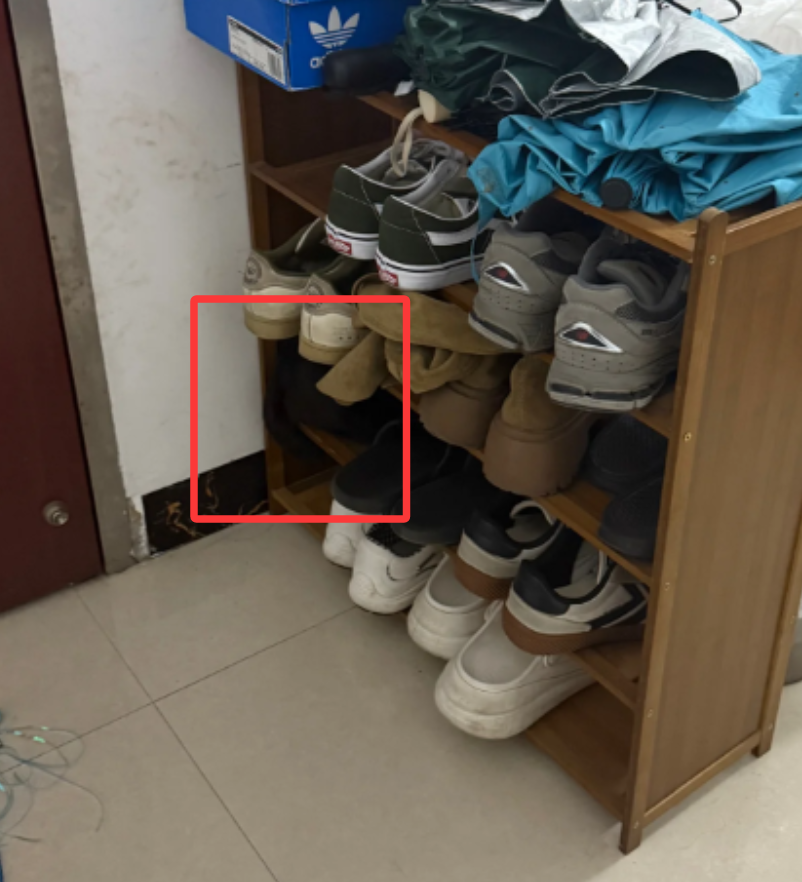 最后发现在鞋架的下边,圈起来的位置。