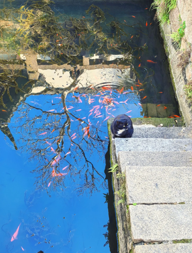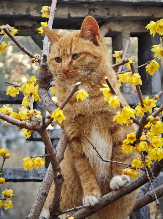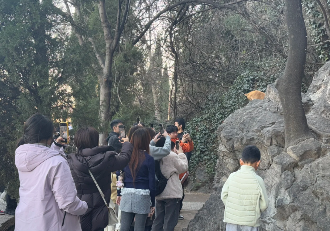 园林也不看了,花也不赏了,一群人围着猫咪。