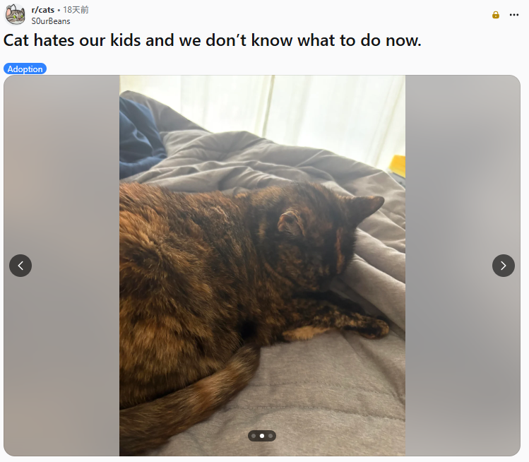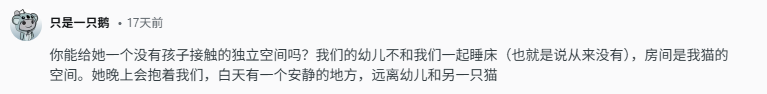 正如标题所说,有网友发帖求问:猫讨厌我们的孩子,我们现在不知道该怎么办?