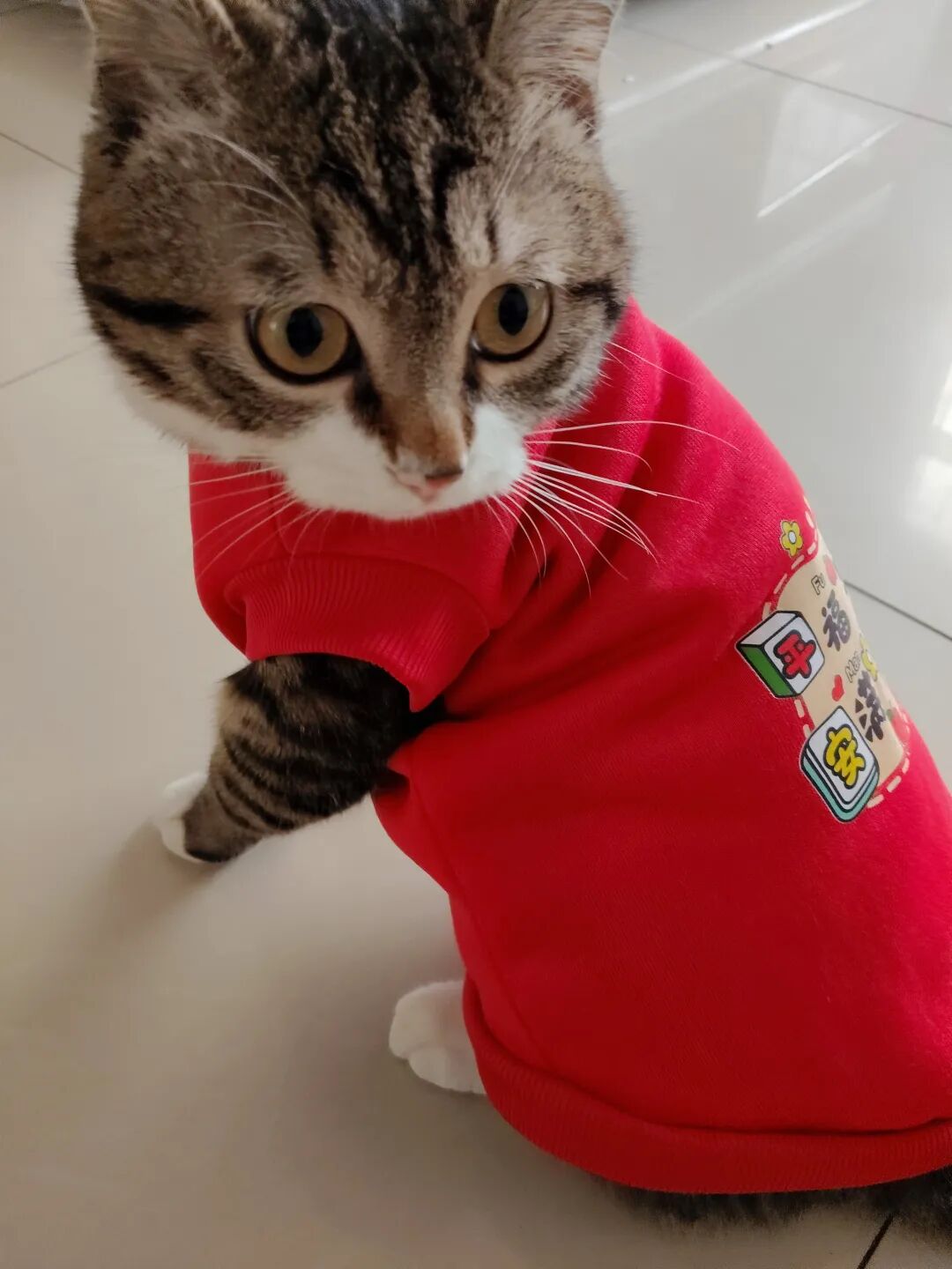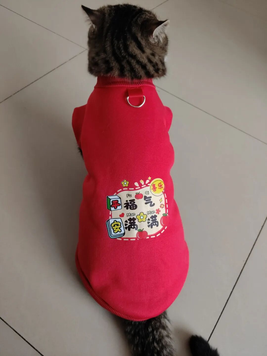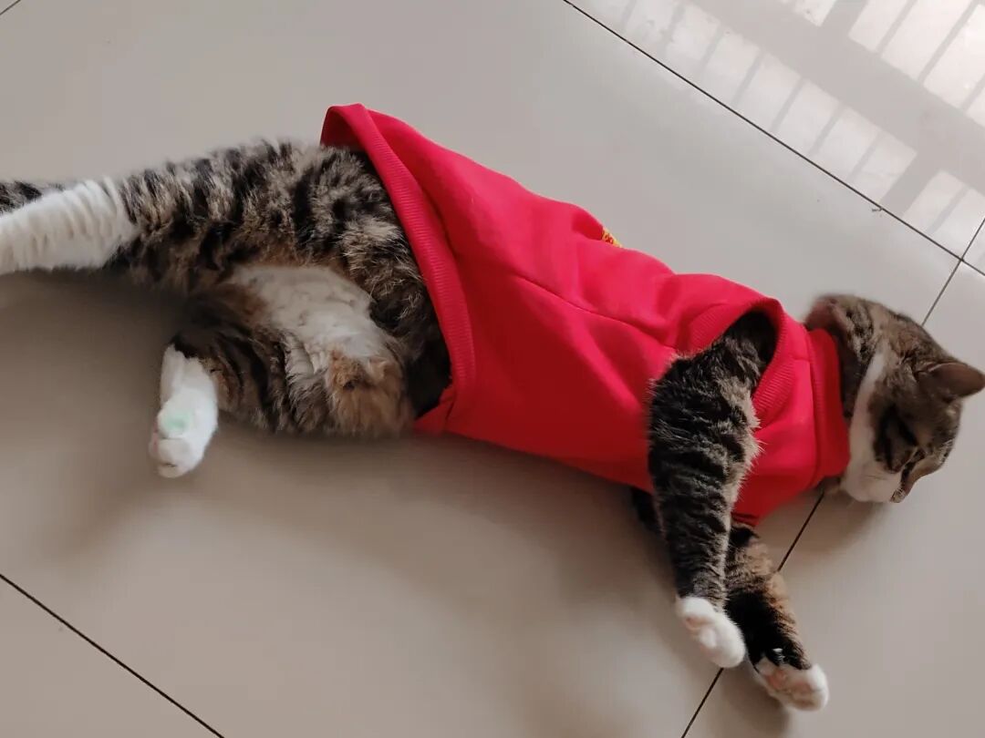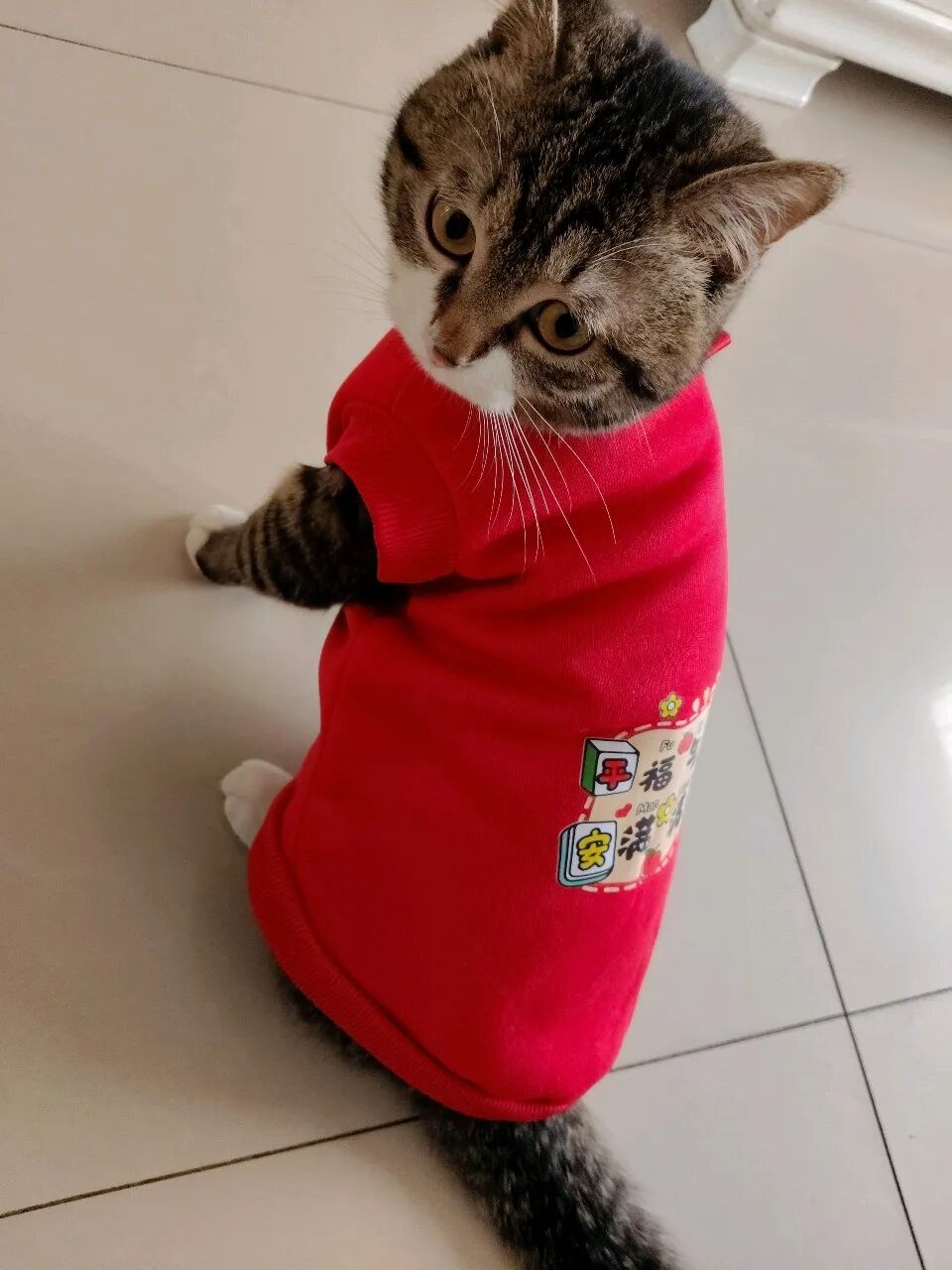 这不今天拿来,一脸抗拒,费事巴力地套上,说实话,还挺好看的,喜庆,可猫仔不喜欢,嫌弃。