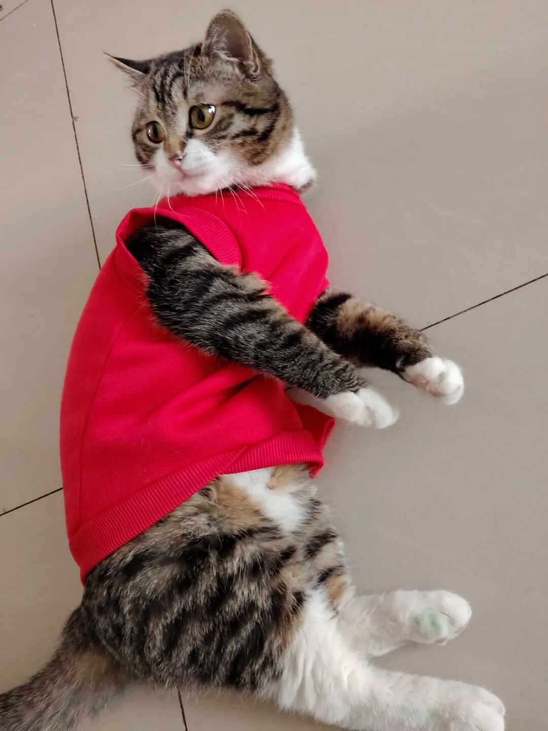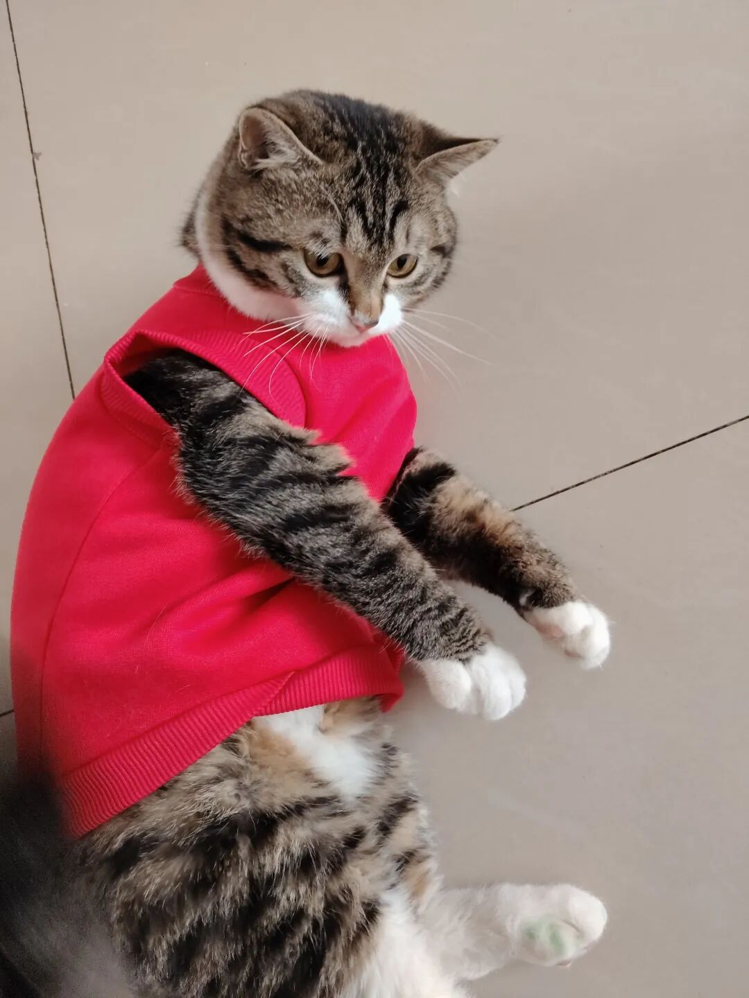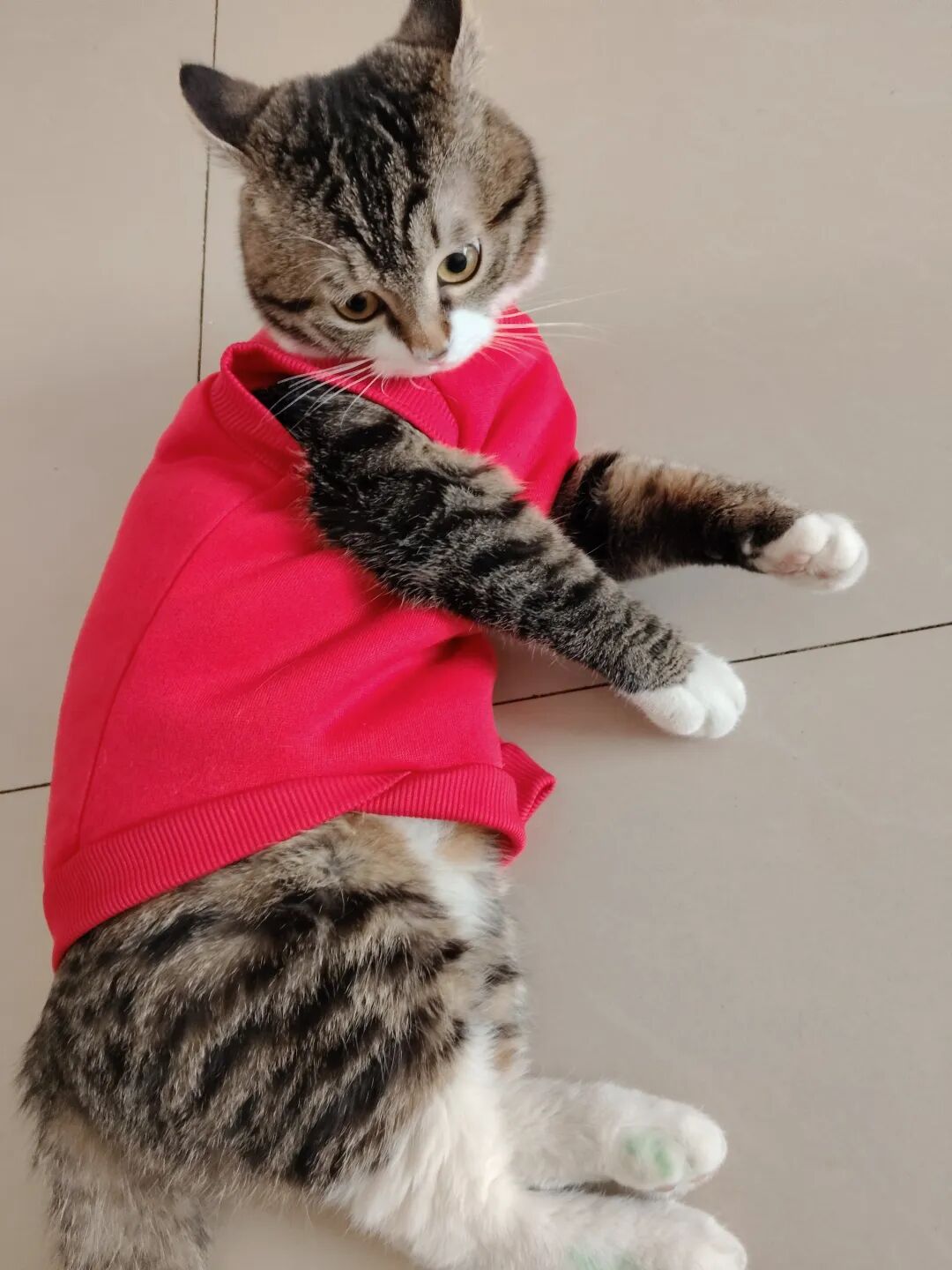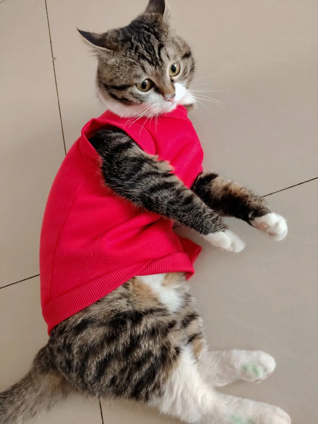 这不今天拿来,一脸抗拒,费事巴力地套上,说实话,还挺好看的,喜庆,可猫仔不喜欢,嫌弃。