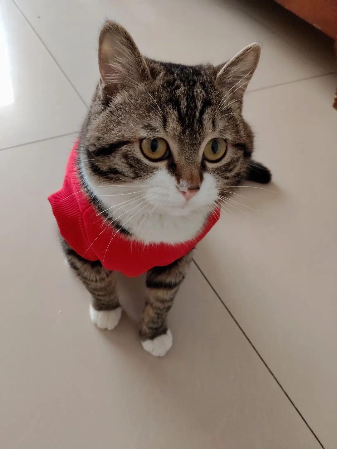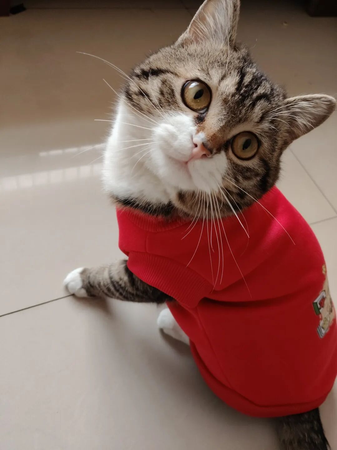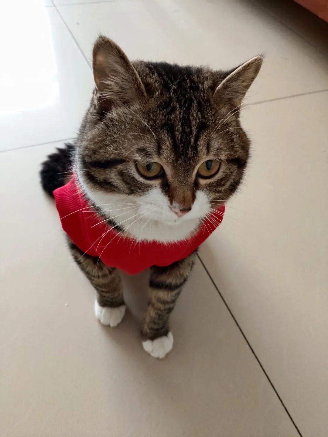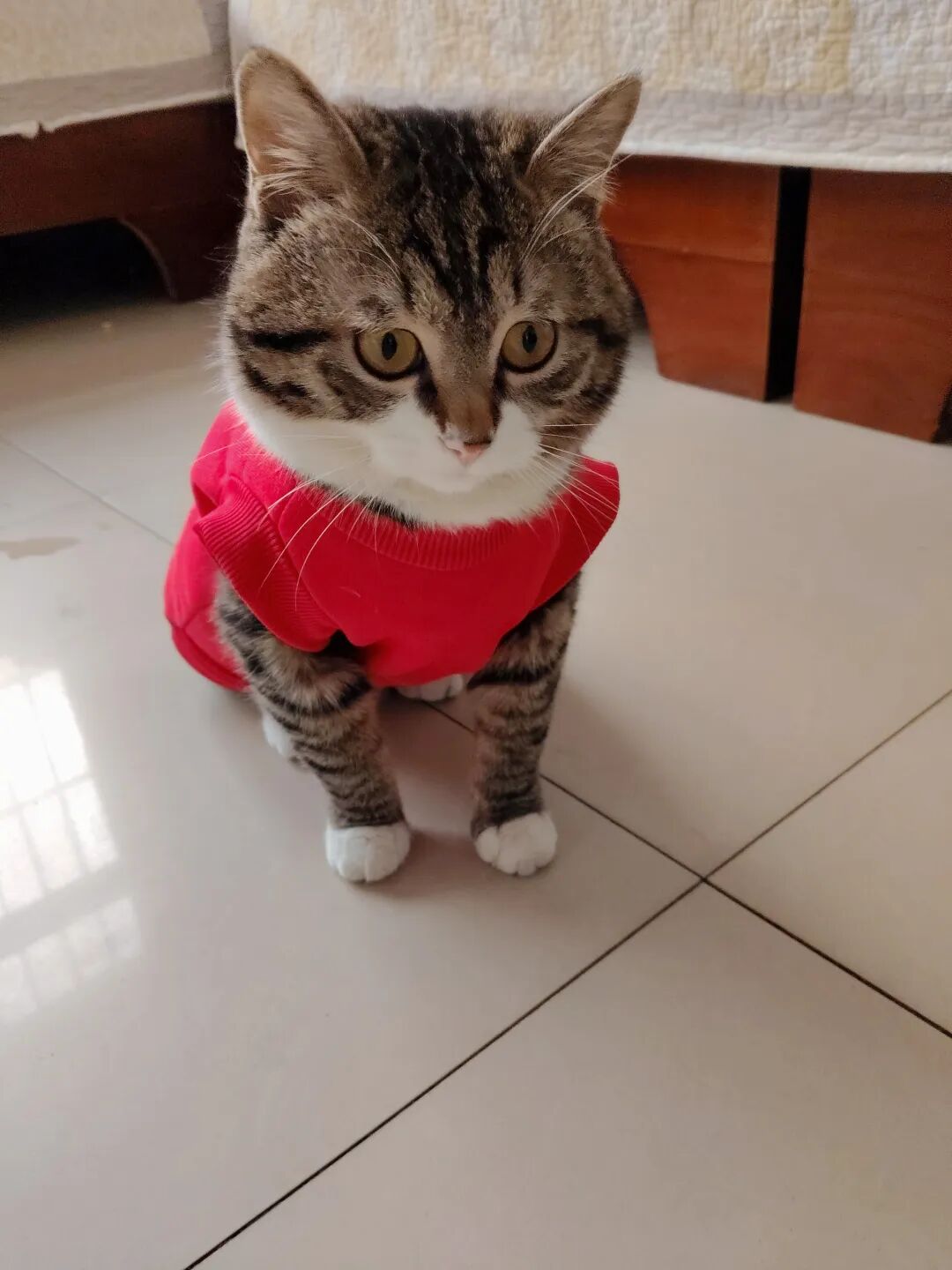 这不今天拿来,一脸抗拒,费事巴力地套上,说实话,还挺好看的,喜庆,可猫仔不喜欢,嫌弃。