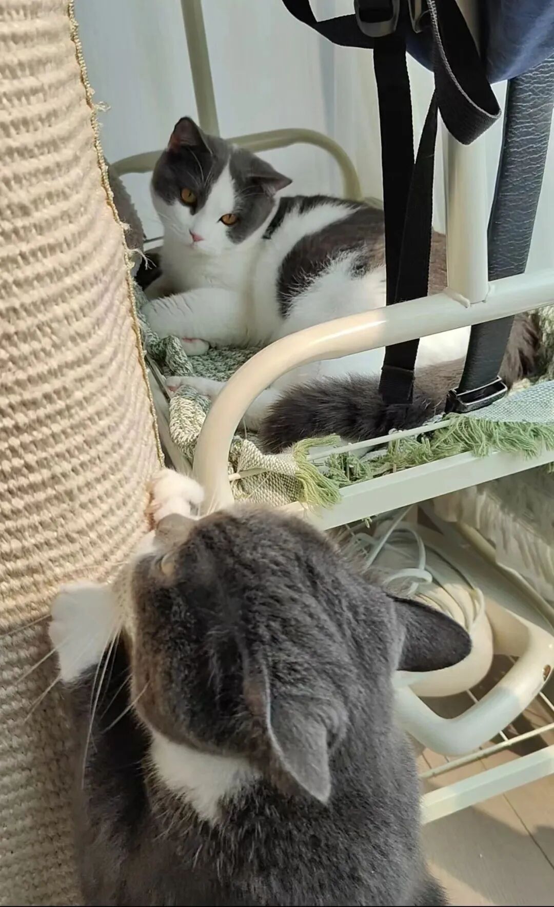 真是难为小猫了。幸运的是,后来除夕和中分都适应得不错。安安稳稳的趴在猫窝里,也不吵闹。无论如何,她们内心深处一定曾经存有巨大的疑惑和委屈吧,不知为何一到夜间就被迫绑起来,失去长达8小时的自由。从最开始头几天的逃避、挣扎、嚎叫,到如今人蹲在猫窝前一句“小猫,过来”,她们就会条件反射般朝人飞奔而来,等待人类给自己戴上绳索。这又是一份怎样的信任和爱呢?与漫漫长夜做对抗,满脸渴望地注视着人类,不断驯服自己的天性,学着像人类一样晚上呼呼大睡......想到这,我的鼻头按捺不住一酸,眼眶也不断发热。直到隔天晨曦微露,除夕和中分,这两个小家伙又会轮流变成猫猫闹钟,中分呼唤次数比较多,除夕偶尔也会出声——“喵喵喵喵”,不停呼唤着自由。