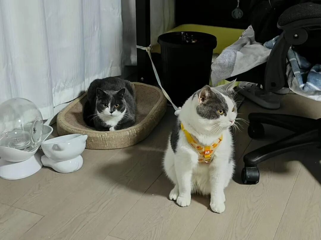 我们把猫窝、猫砂盆、水碗和智能喂食器都统一放在了阳台右侧,这里还放置了一张大书桌。而书桌的桌腿上,系有2根宠物牵引绳。2条工字型牵引绳,是晚上零点后用来锁小猫的,我们留出大概1米的长度,足够让小猫轻松如厕、吃猫粮、喝水。关于为什么晚上睡觉要把小猫锁起来这一点,一度让我愧疚,不安。总觉得剥夺了她们夜间的自由,何其狠心。但又迫于现实条件,不得不这样做。