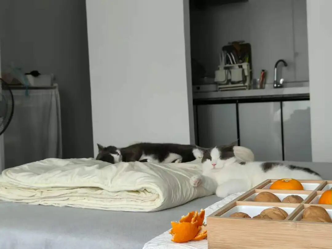 除夕在春季4月的尾巴生下中分宝宝后,又一起与我们生活将近6个月,这时已经迈进秋冬季节了。碰巧我又换了新工作,骑车通勤1个小时实在太折磨人了,于是我们决定——搬家,搬到一个双方通勤都折中的地方,搬到一个能充分晒得到太阳的家。新家,有一个大大的阳台,对面就是南湖公园,整个房间采光非常好,楼下就有热闹的菜市场和超市,采购也很方便。天气好的时候,室内阳光照射非常足,照得整个家明亮又通透。我们都很喜欢这个新家,包括两位小猫。小猫到新家后,终于可以舒舒服服地晒太阳,都日渐圆润啦,当然这是后话了。