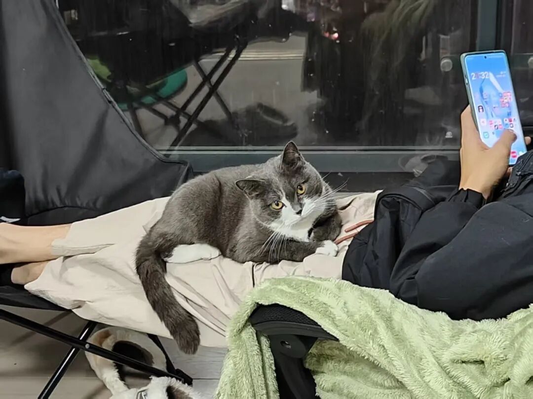 除夕,一般会跳到床边的收纳柜上,趴着俯视整个家,长久幽深地观察我们的一举一动。偶尔也会主动跳上我对象的膝盖,静静趴着。我对象每天晚上吃完饭必做的娱乐消遣——打游戏,他的膝盖就成了除夕最爱的人形猫窝。