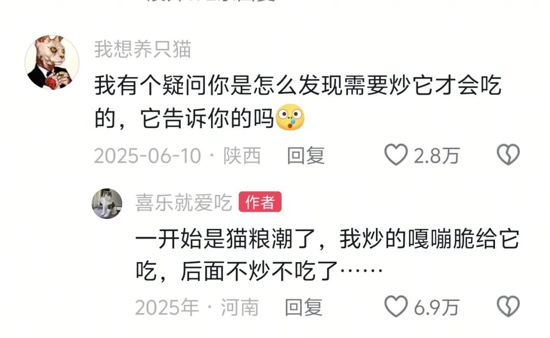 “我感觉是猫看到你吃的都是炒的,它觉得它和你一样,也要吃炒过的。”