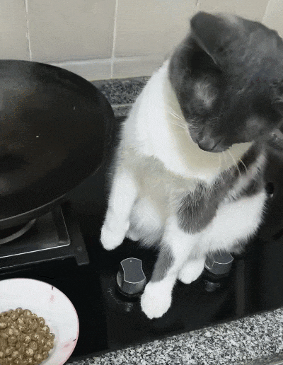 还要蹲在锅旁边,监督铲屎官“炒粮”!