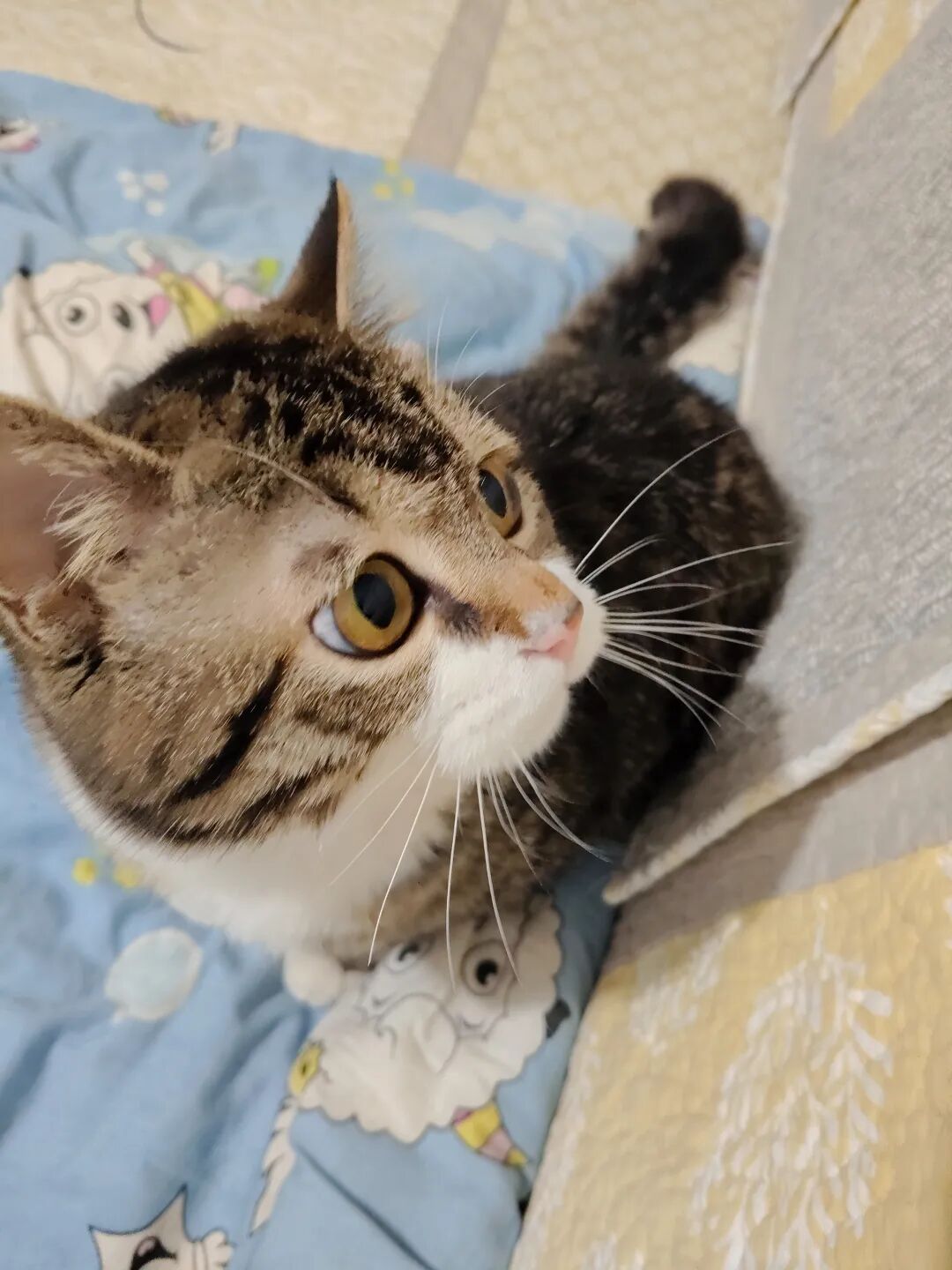 心里还寻思,猫仔晚上没大睡觉,应该在家里迷迷糊糊地补觉吧,中午下班回家,打开门,看到的是,猫仔凑到门口,精神满满。
