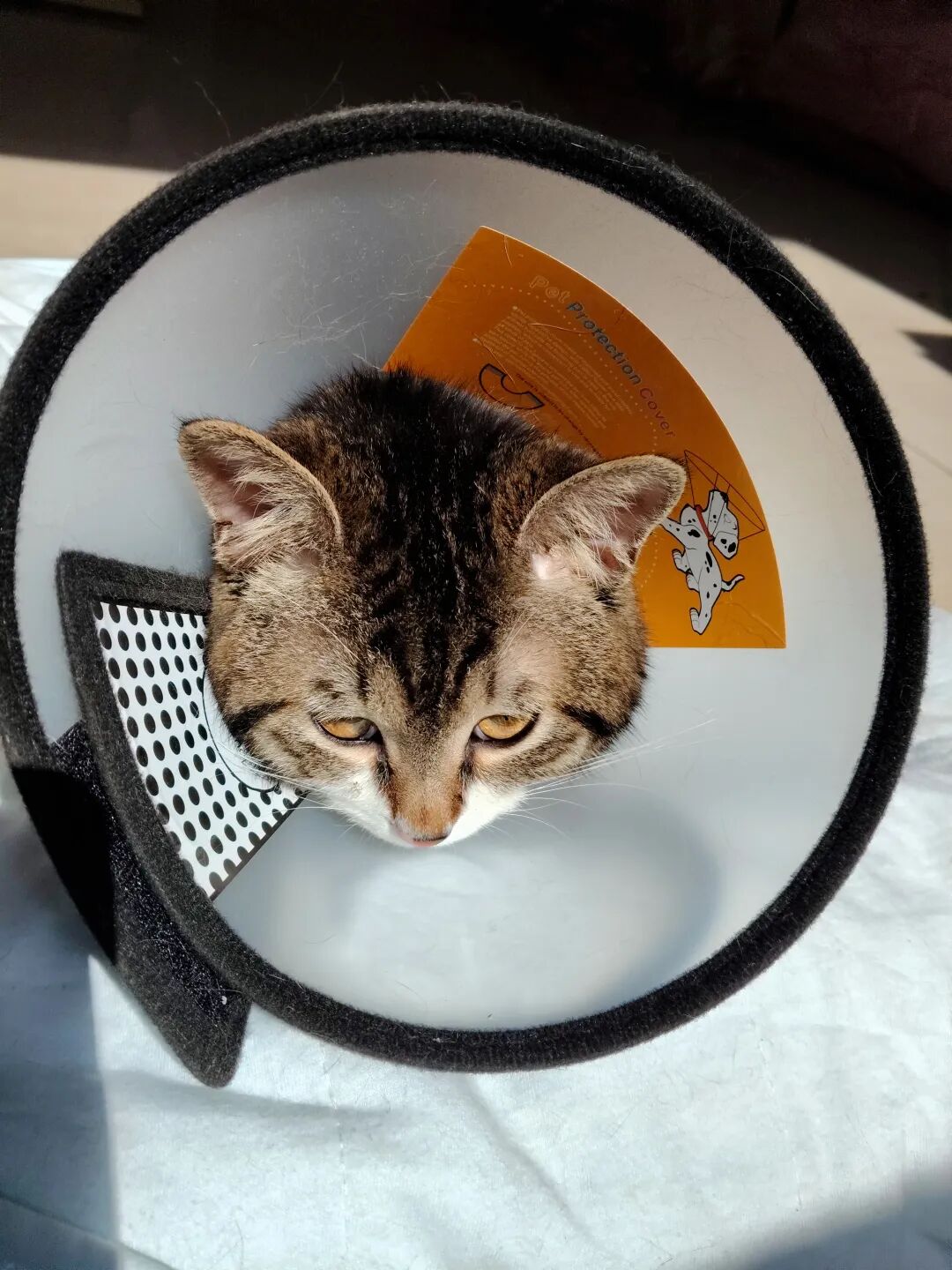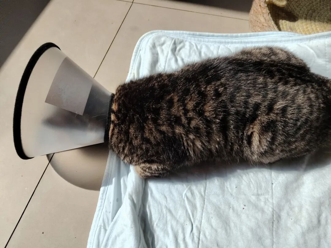 又等着猫仔抬头,打了一针消炎药,带上项圈,我们回家。