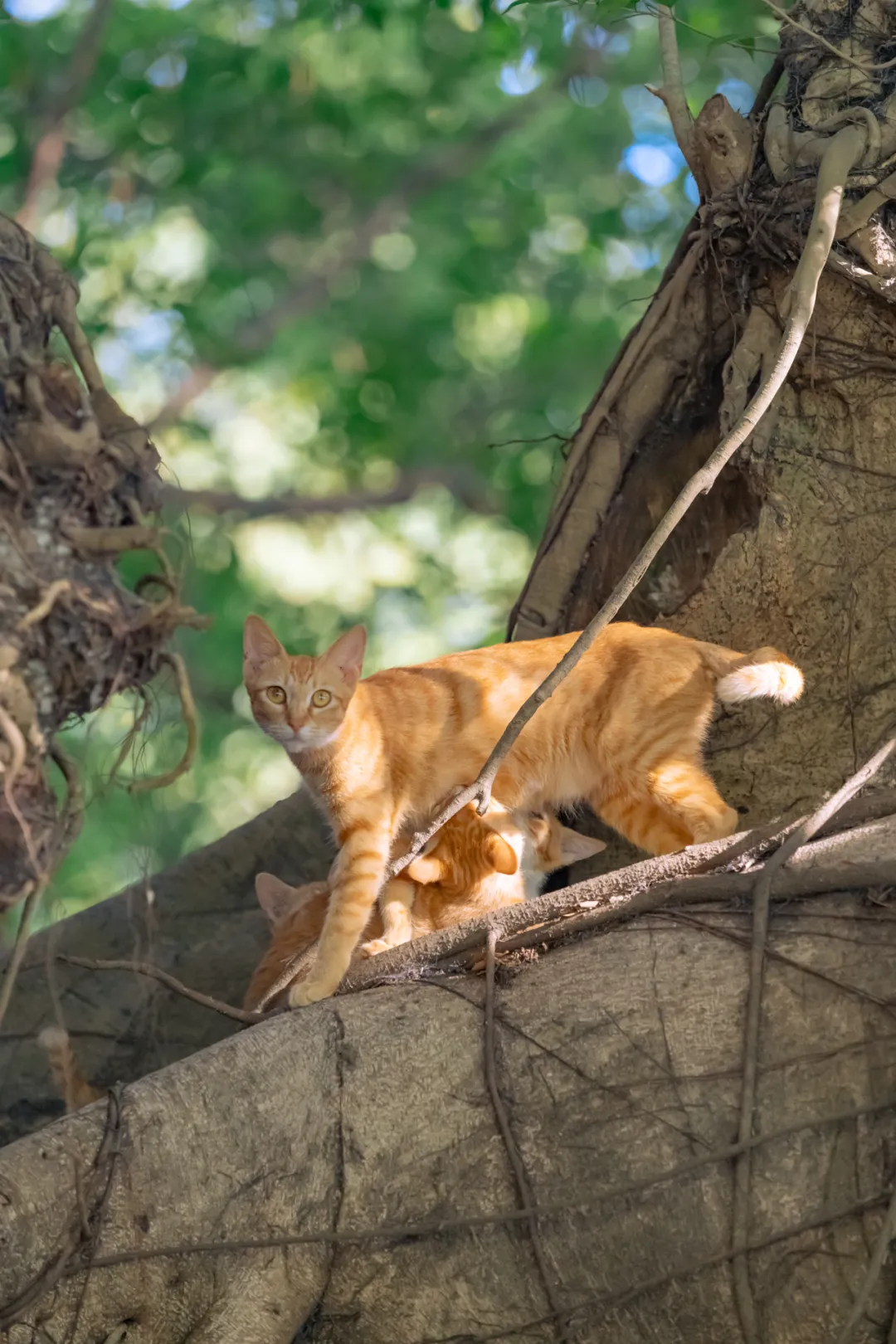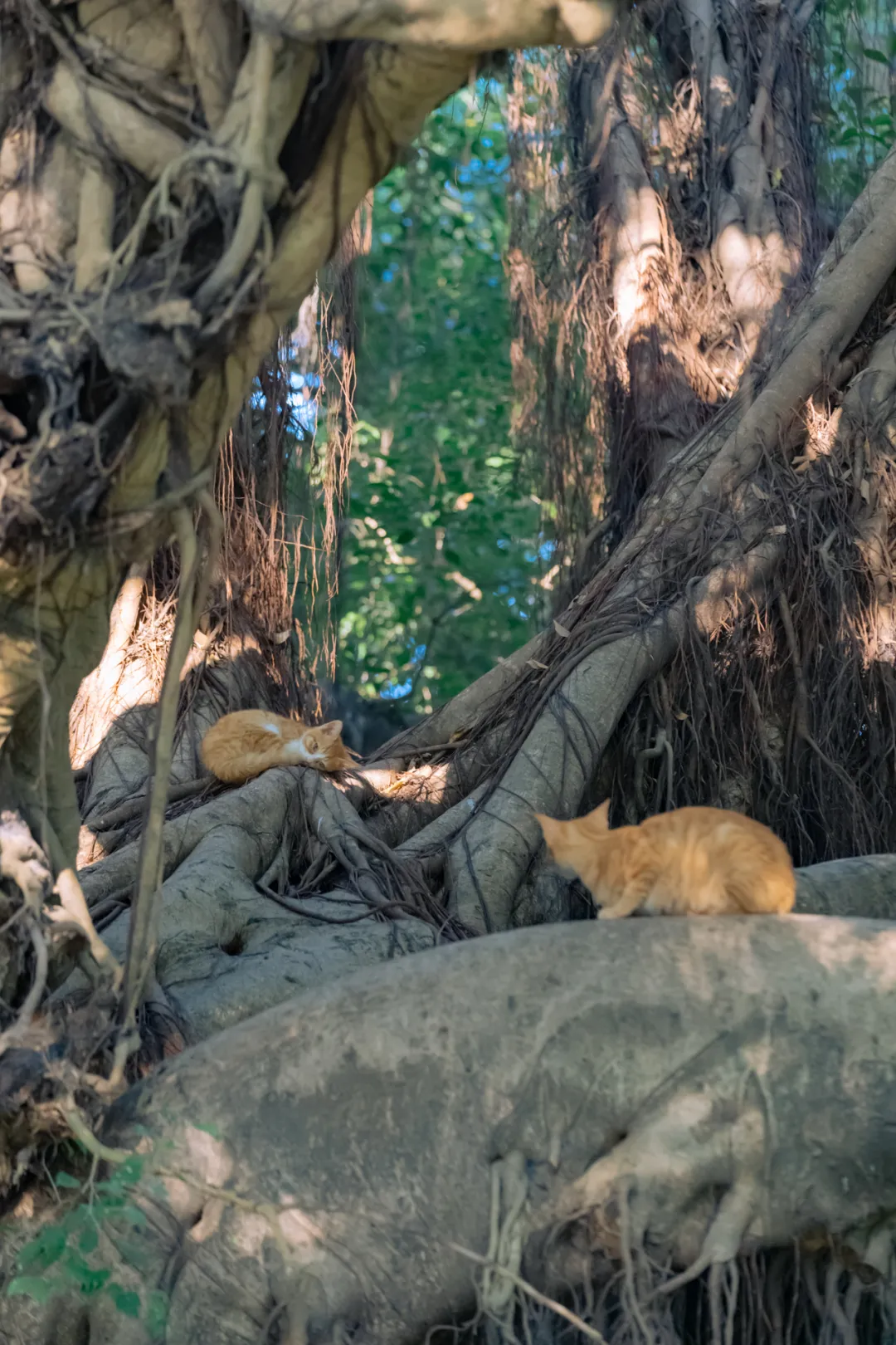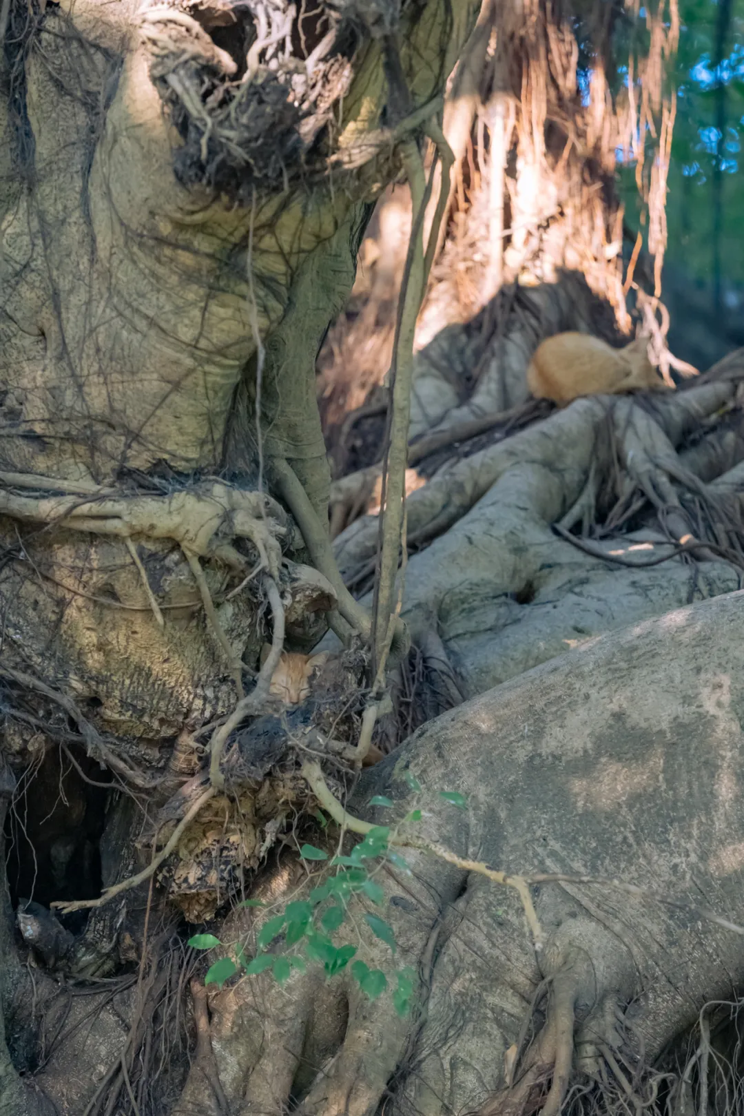 上上周去了深圳做活动,正好也顺便拍一拍本地的猫猫,听闻某公园榕树上竟有一窝小奶猫,当天下午便赶过去一探究竟,可能是刚下完阵雨,找了半天,等了好久也不见猫猫踪影。不死心次日又去,在傍晚时分终于在树上等到了,原来都在树缝里睡觉呢,遇见时正赶上猫妈喂崽崽奶,一带四不容易哦