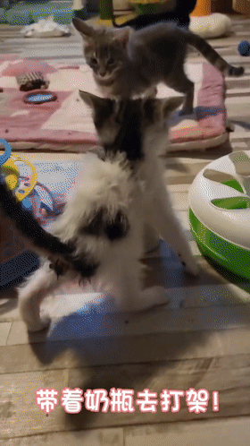 猫咪打架的视频和故事真的不要看的太多,但如标题说的小猫咪打架不忘拖着奶瓶,居然还所向披靡诸位大侠可曾见过?